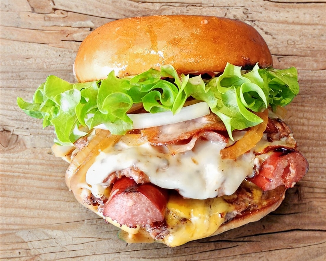 Doble carne de res, queso cheddar blanco y amarillo, tocino, jamón, salchicha de res tipo costco, tomate, cebolla cruda y asada, lechuga, aderezo de la casa, cátsup. Esta ENORME.