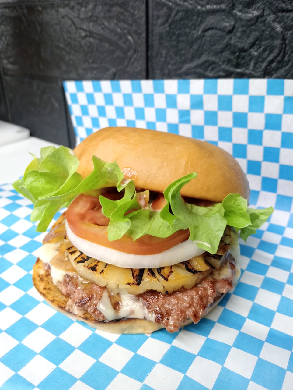Carne de res, queso cheddar blanco y amarillo, tocino, jamón, piña asada, tomate, cebolla, lechuga, cátsup.