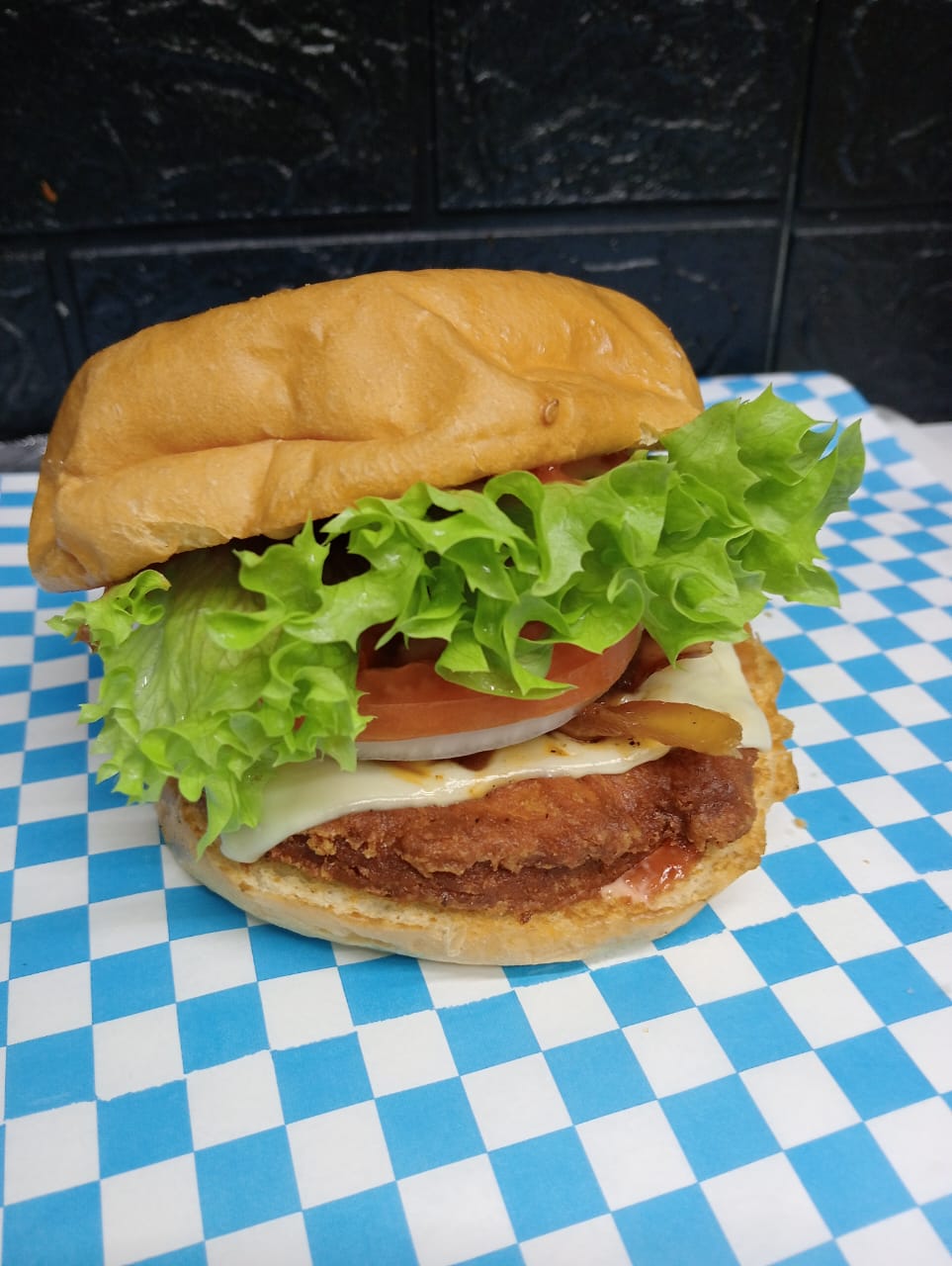 Carne de pollo, queso cheddar blanco y amarillo, jamón, cebolla asada y cruda, tomate, lechuga, aderezo de la casa, cátsup.
