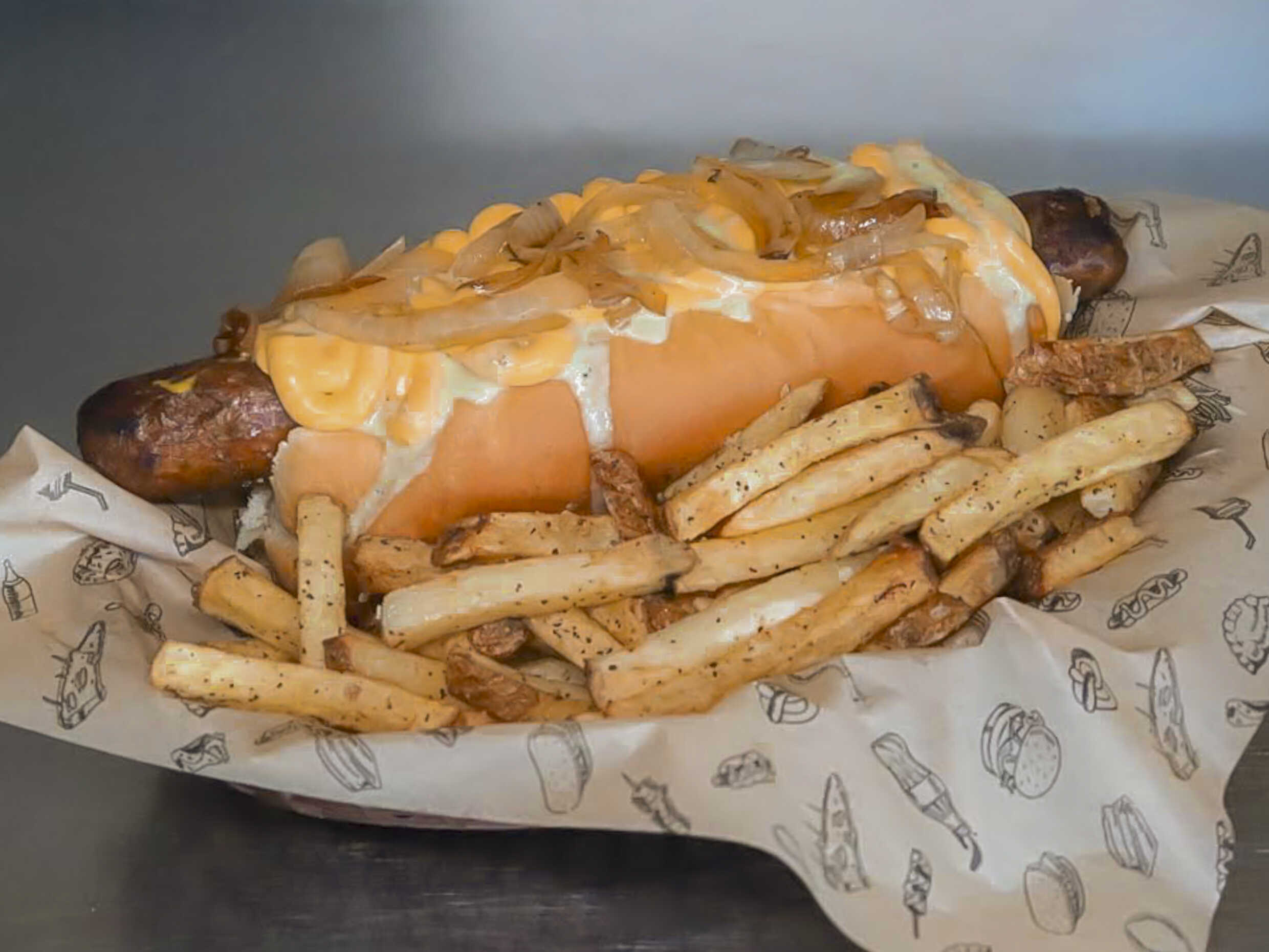 Salchicha ahumada hecha a mano, 100% pierna de cerdo, cebolla asada, queso para nachos y aderezo de jalapeño.