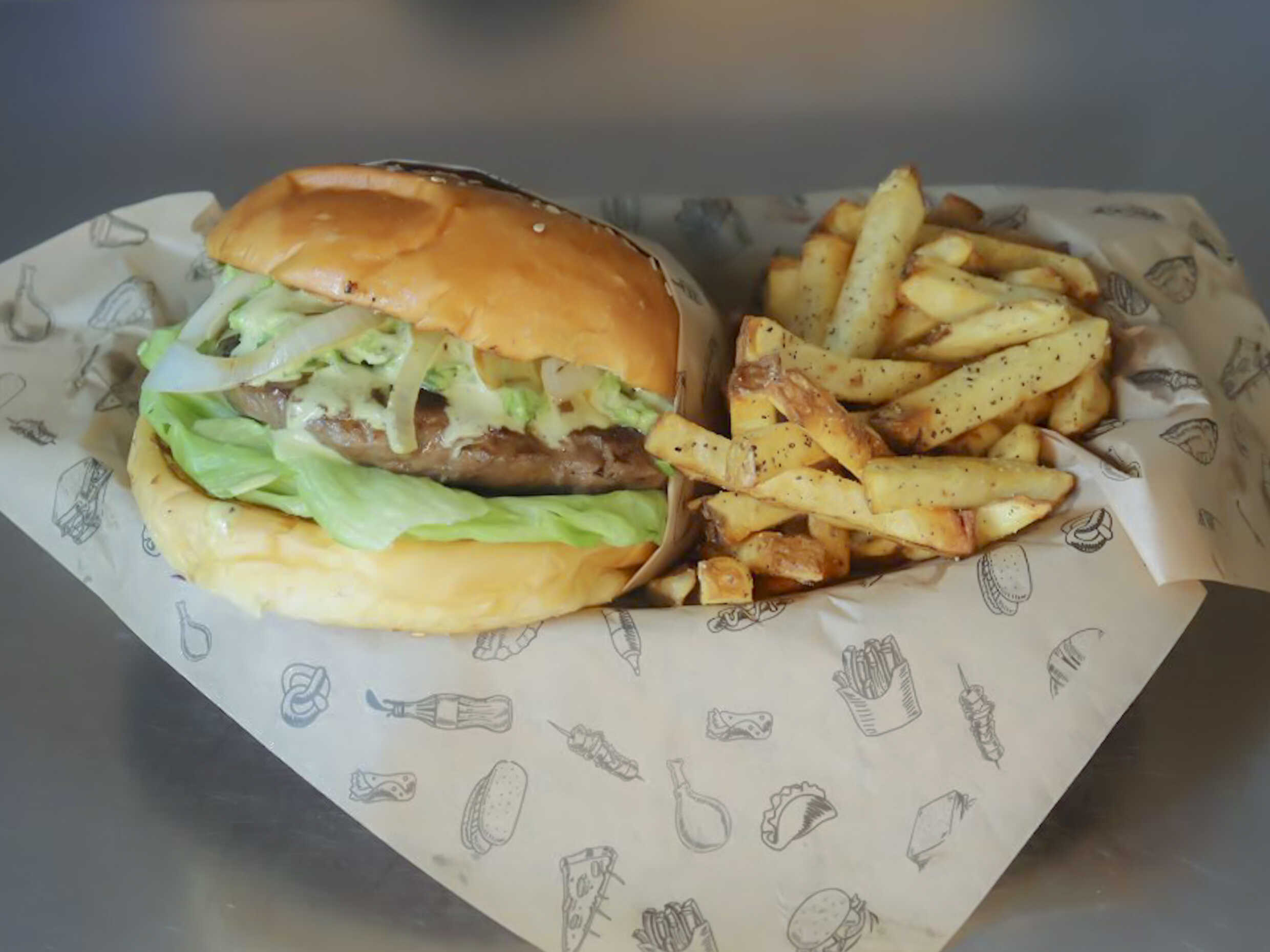 hamburguesa con pan artesanal, 100% carne de res artesanal , con lechuga, guacamole, cebolla asada, aderezo de cilantro y jalapeño.