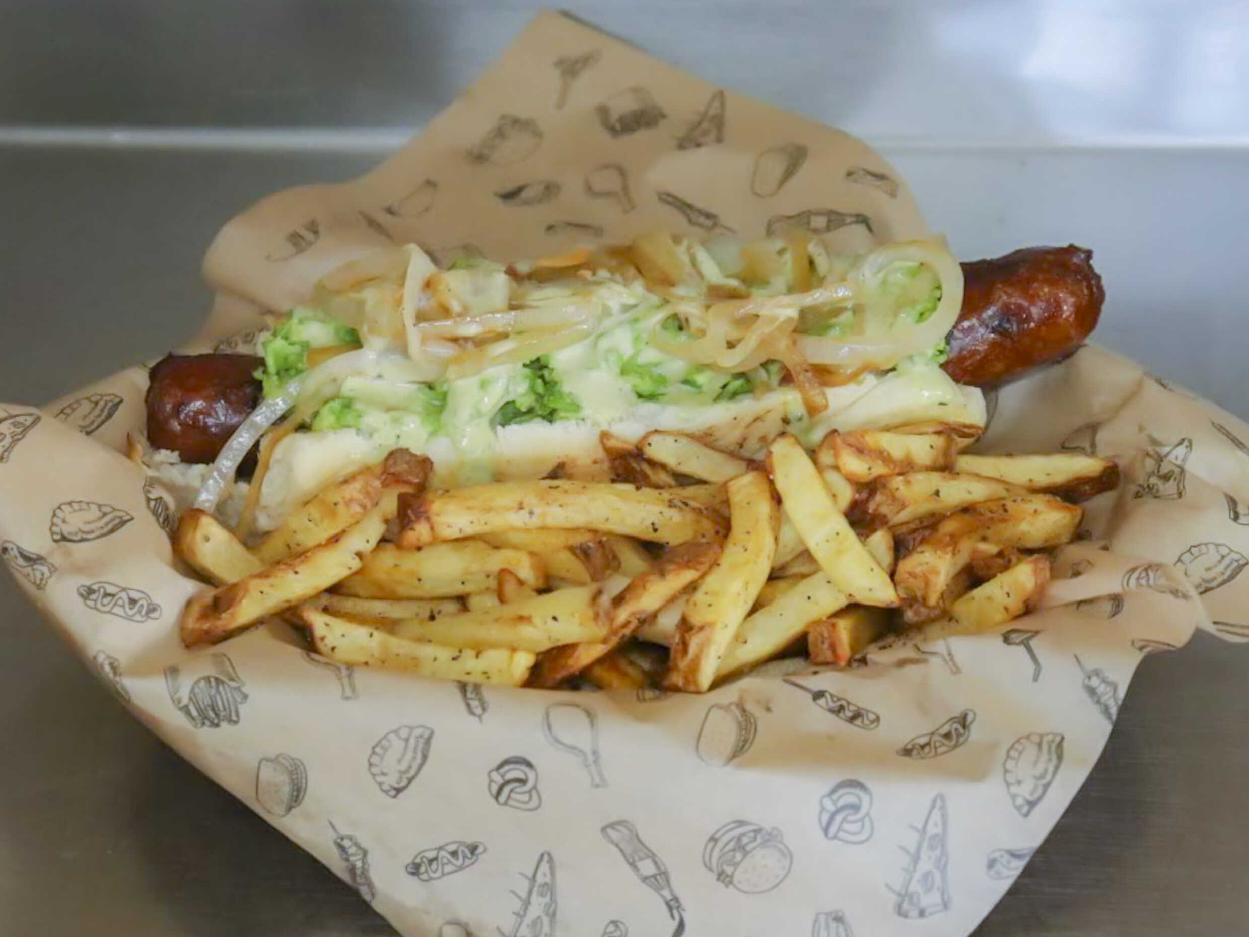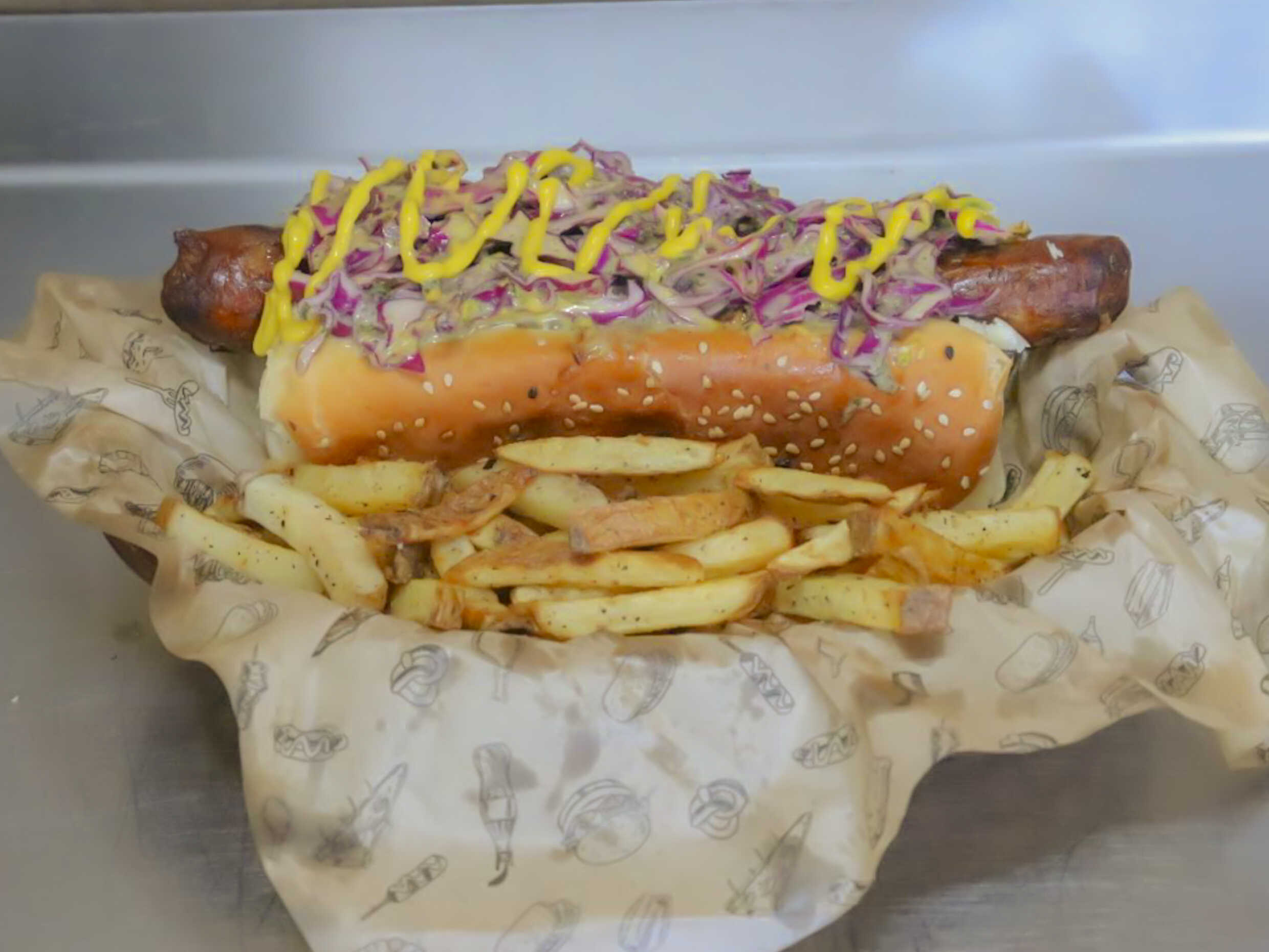 Salchicha ahumada hecha a mano, 100% pierna de cerdo, ensalada de col, morada, perejil, aderezo dulce y un toque de mostaza.