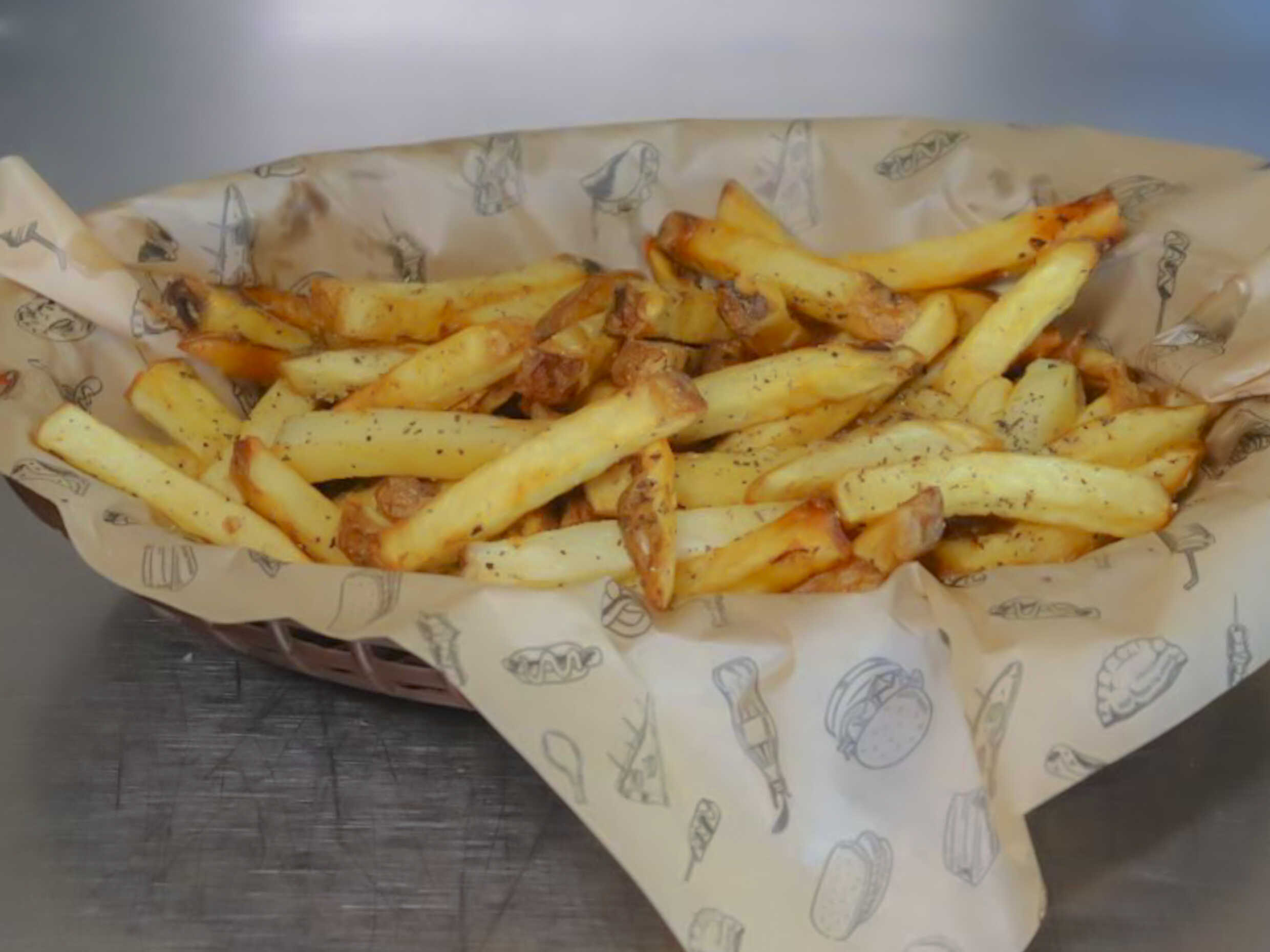Papas fritas %100 naturales con aderezo de perejil chili beans, salchichas picadas en rodajas y queso de nachos
