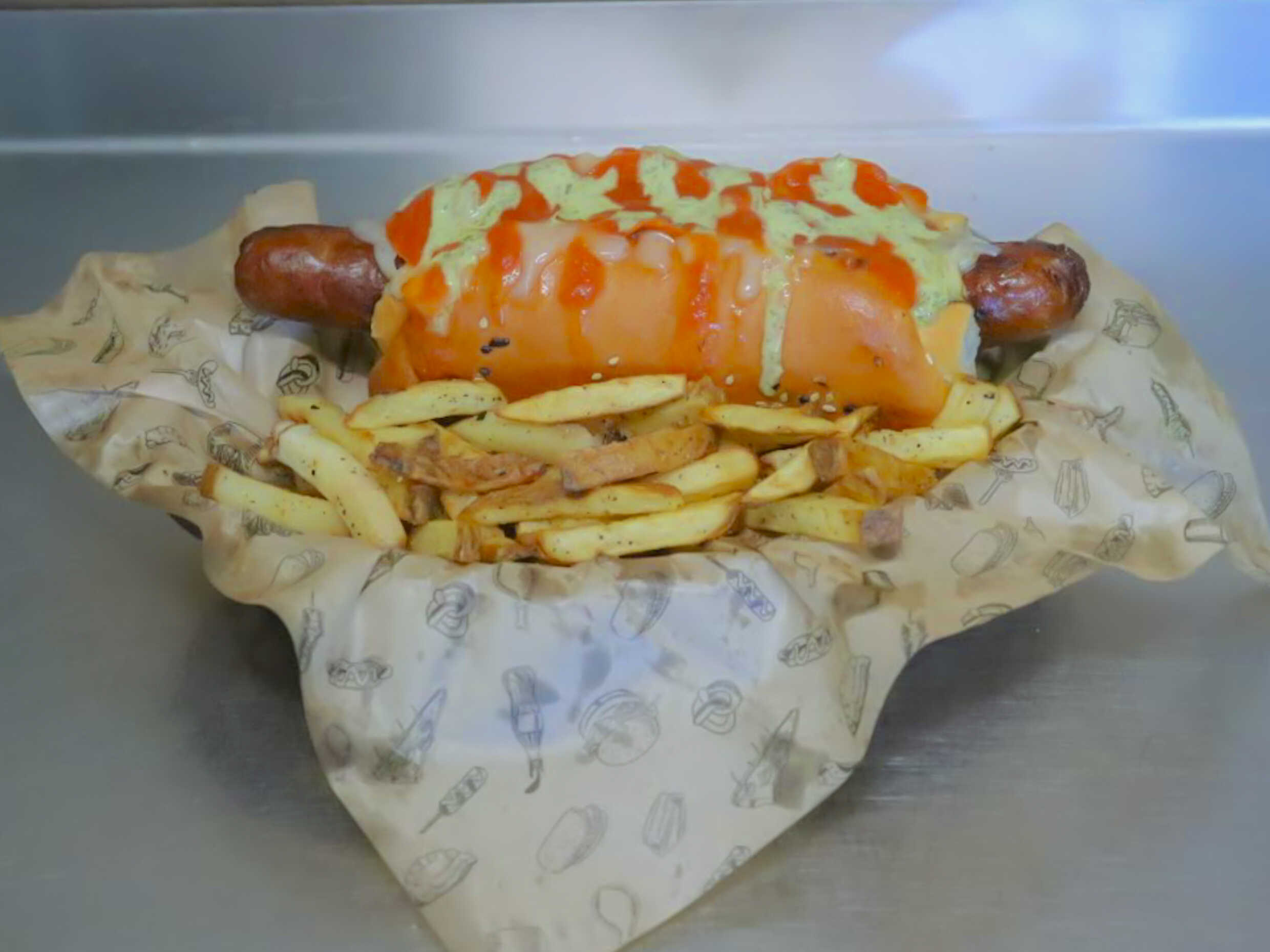 Perro charro con pan artesanal, salchicha ahumada hecha a mano, 100% pierna de cerdo, guacamole, cebolla asada, cilantro y aderezo jalapeño.