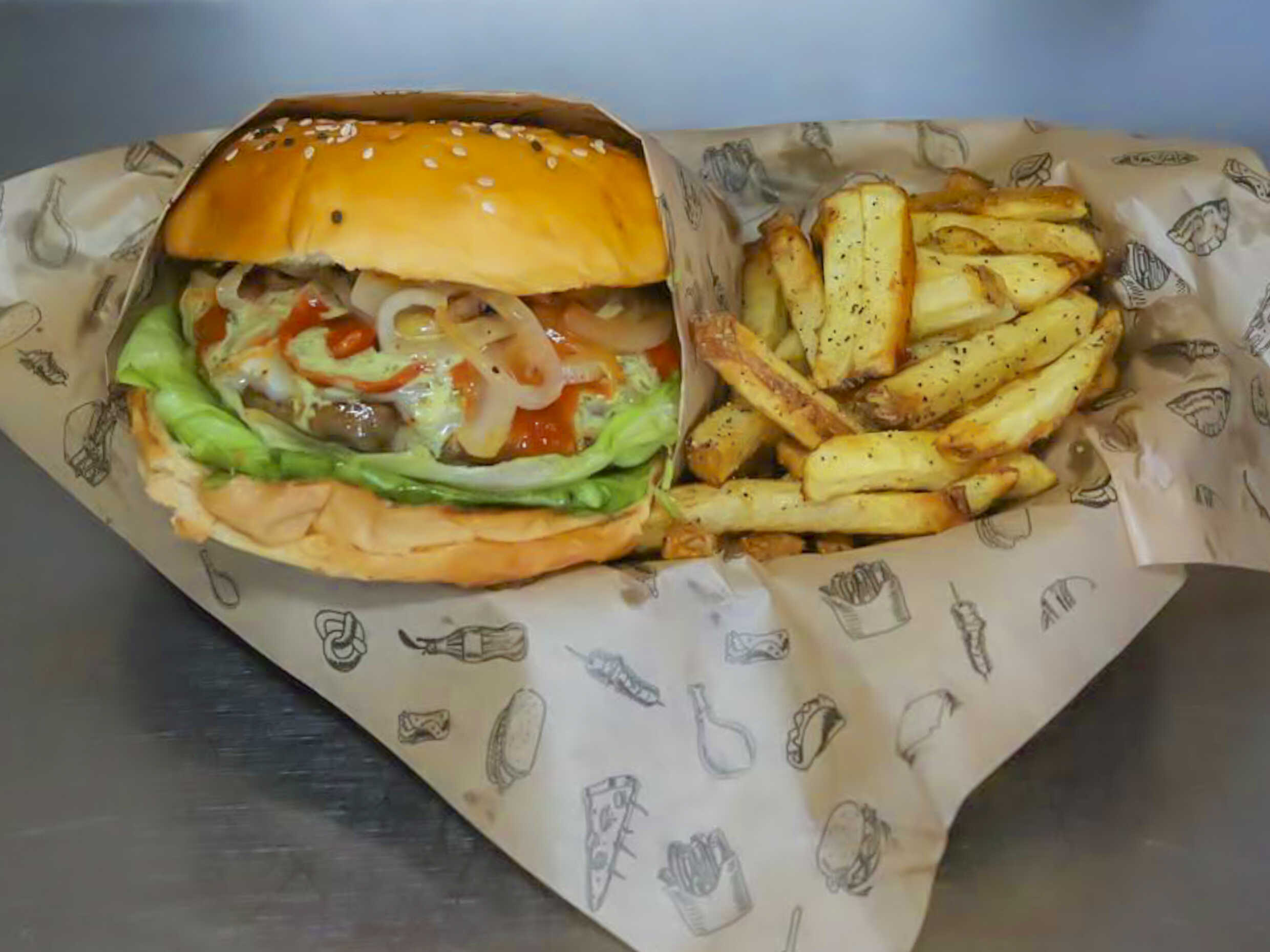 100% carne de res con lechuga, ensaladade col morada, cebolla asada, aderezo de perejil y mostaza.