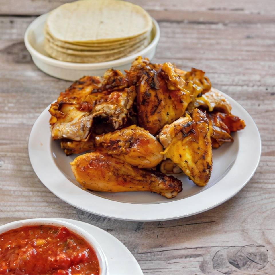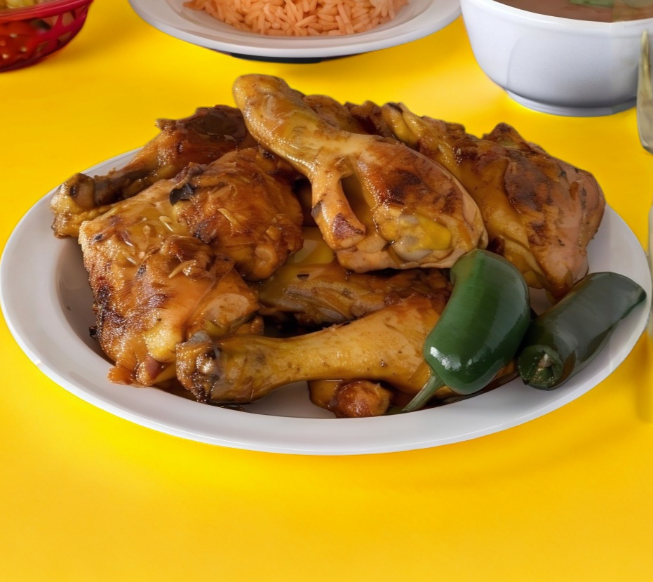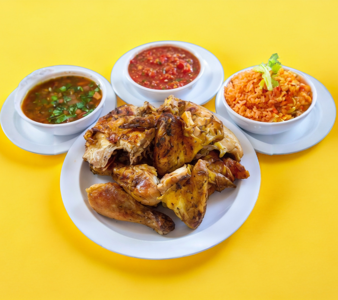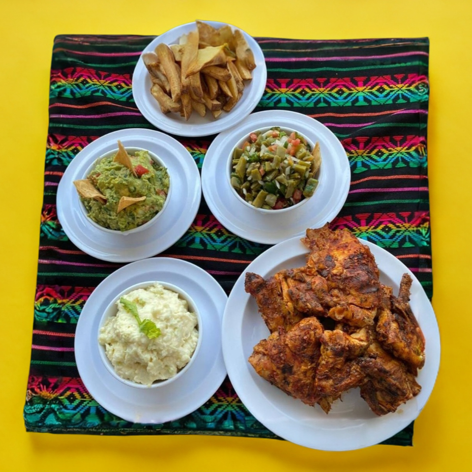 1/2 pollo, 1 complemento, 1 soda, salsa roja, tortillas, totopos, chiles y cebollas.