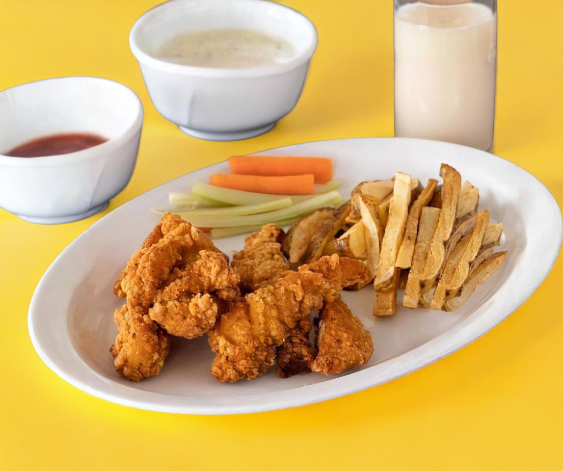 1 frijol, 1 arroz, 1 ensalada, 1 papas fritas, salsa roja, tortillas, totopos, chiles y cebollas.