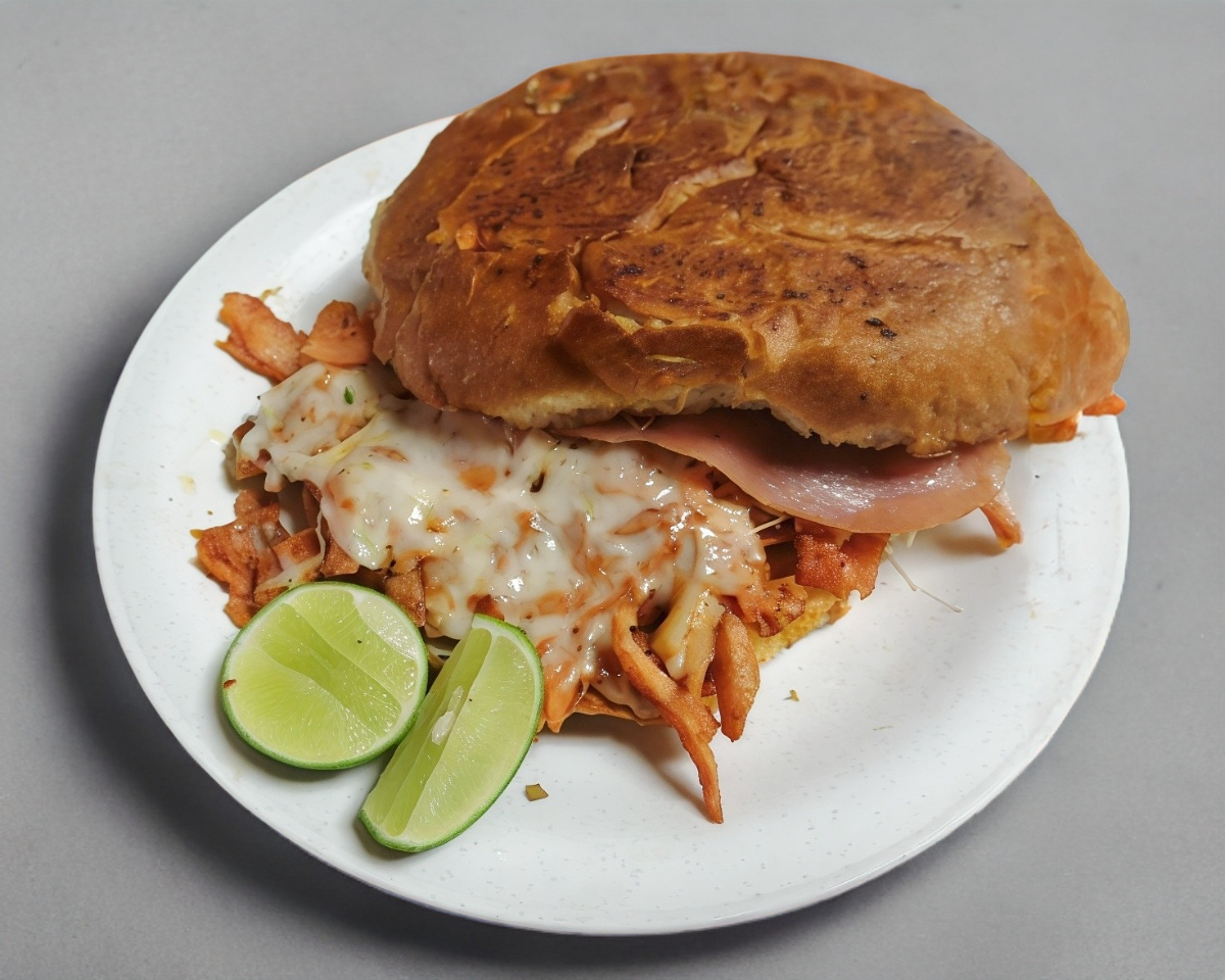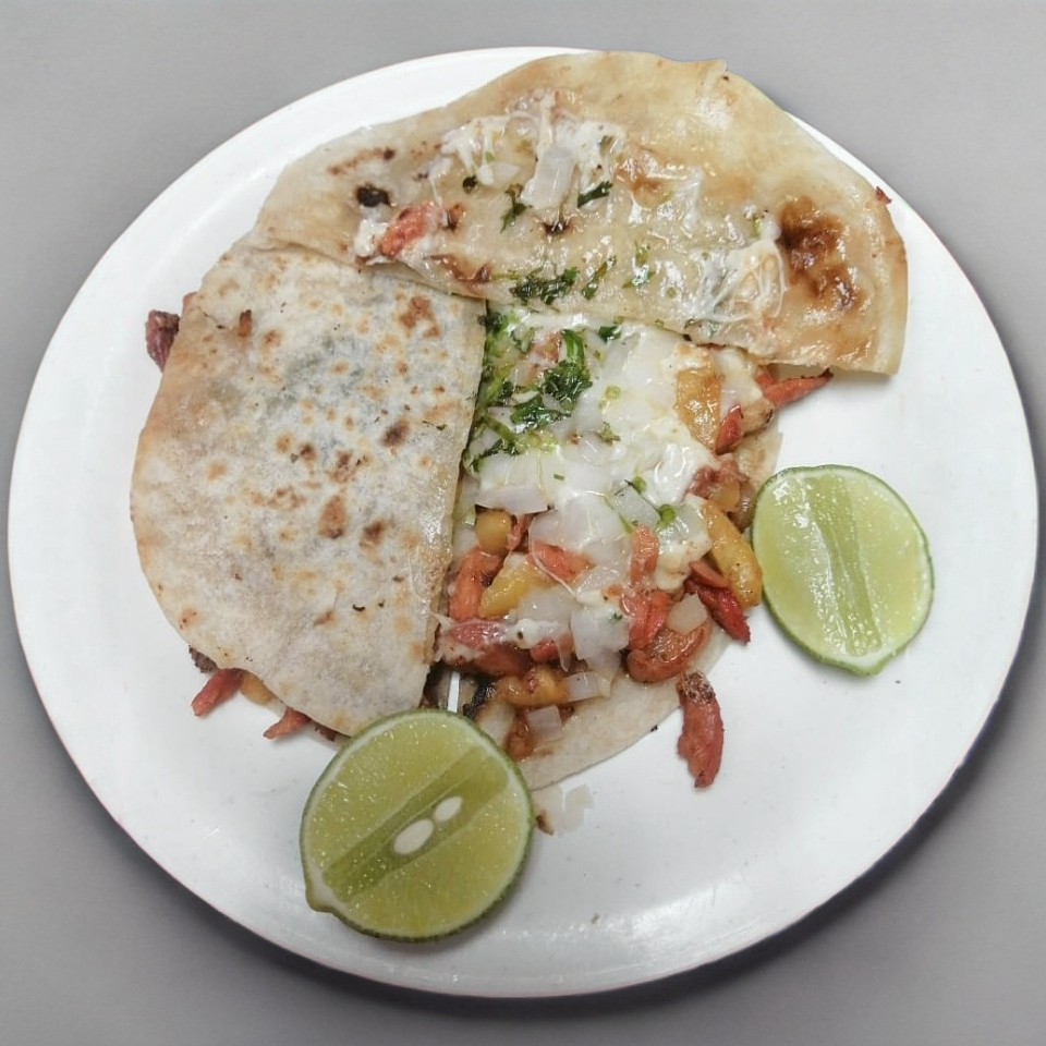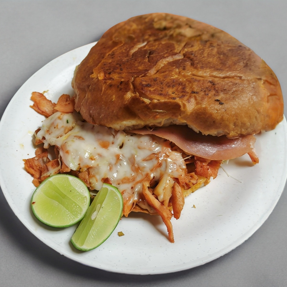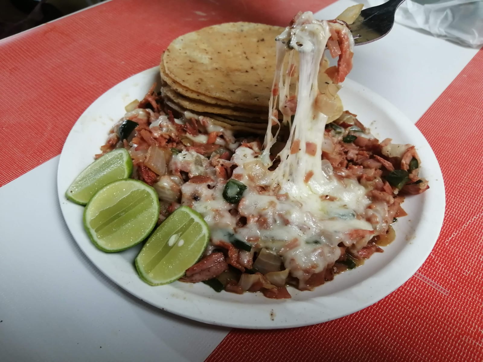 Cebolla, poblano, jamon, chuleta de puerco, tocino carne al pastor y queso gratinado, incluye tortilla