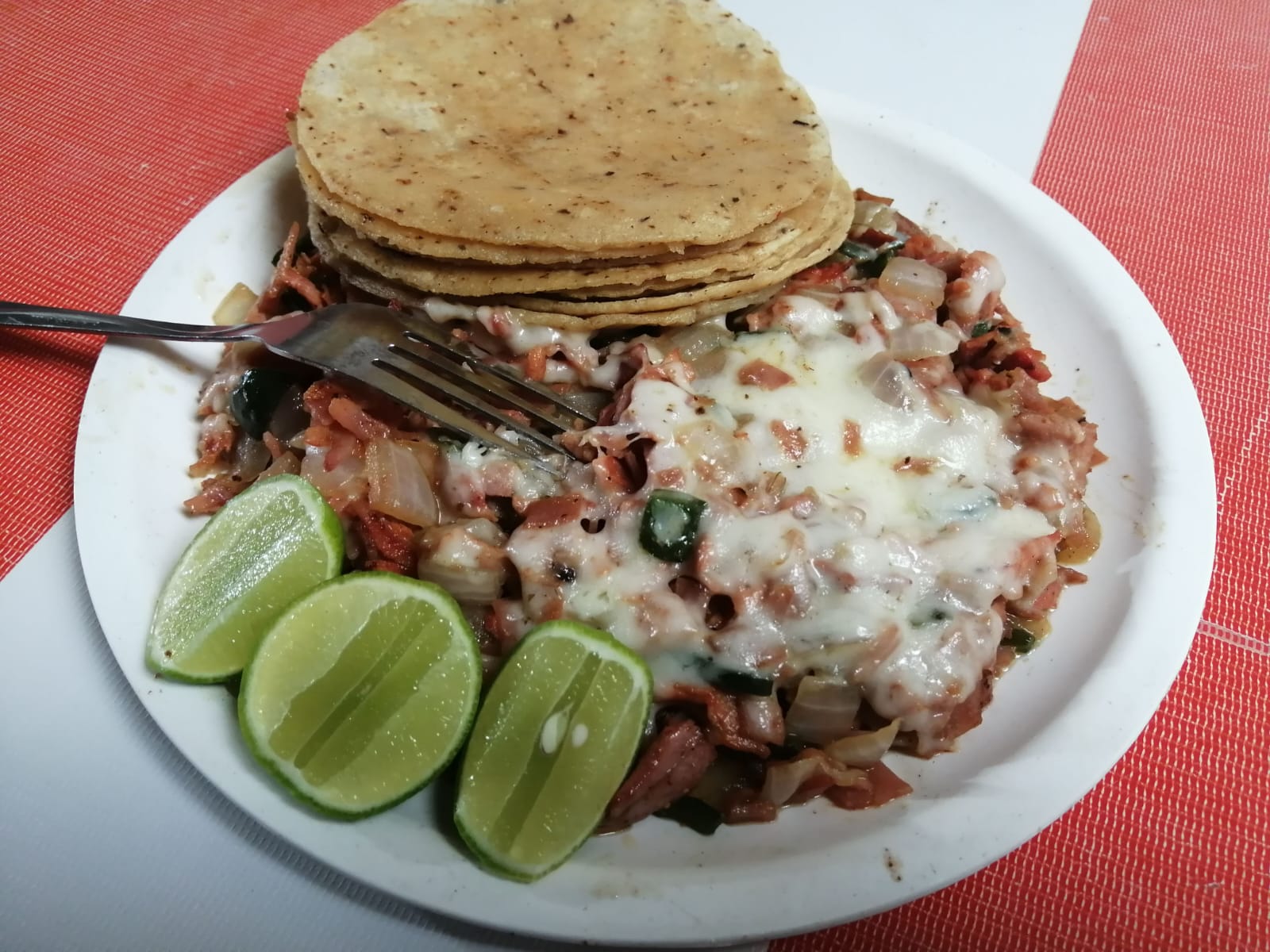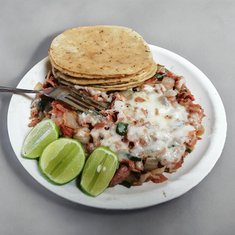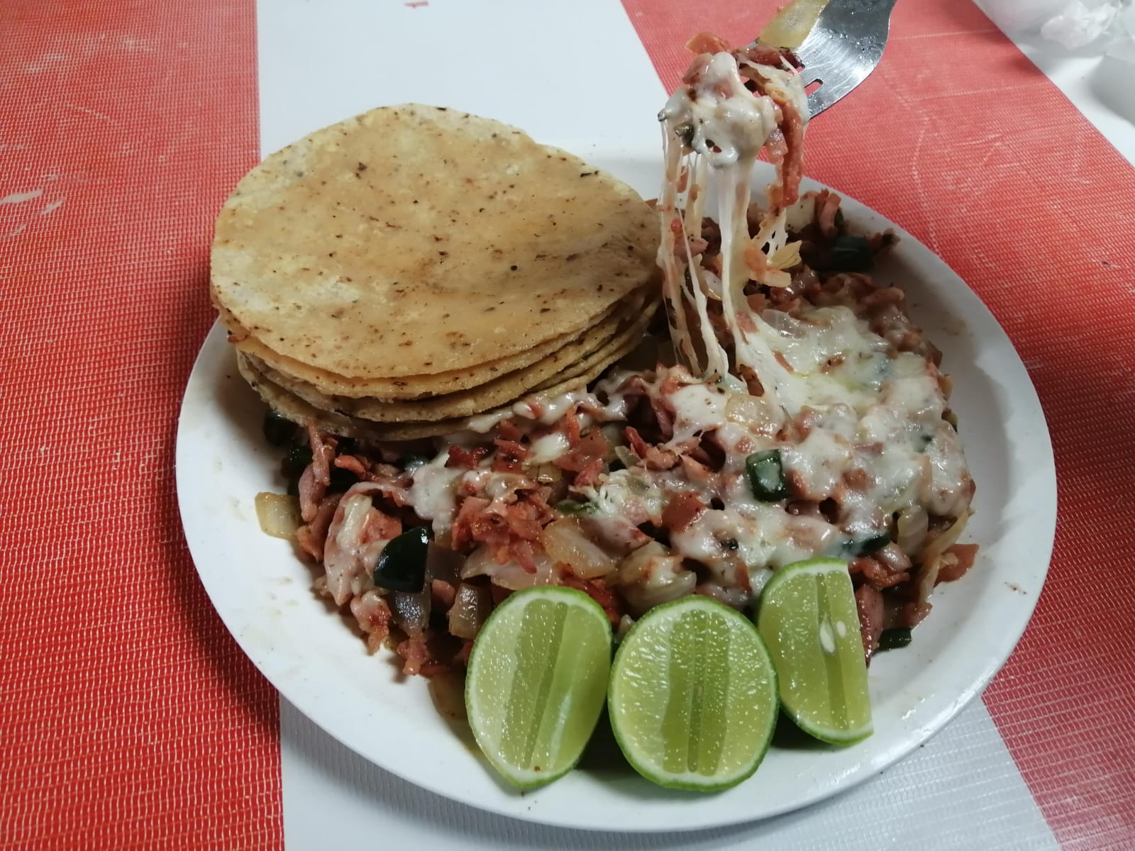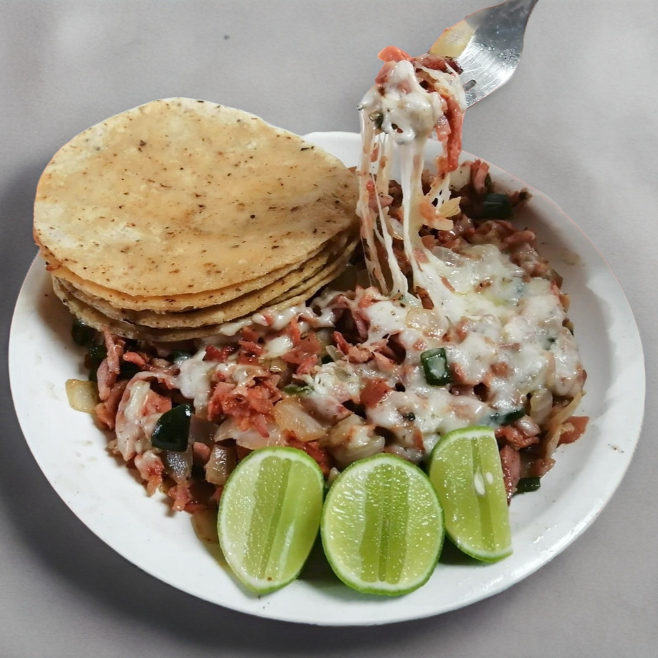 cebolla, chile poblano, jamon, chuleta, tocino, Carne al pastor y queso gratinado incluye tortillas y salsas