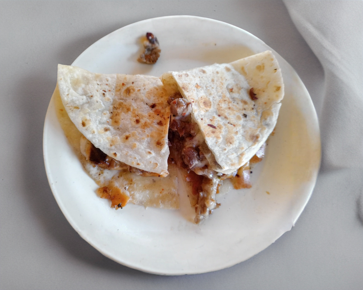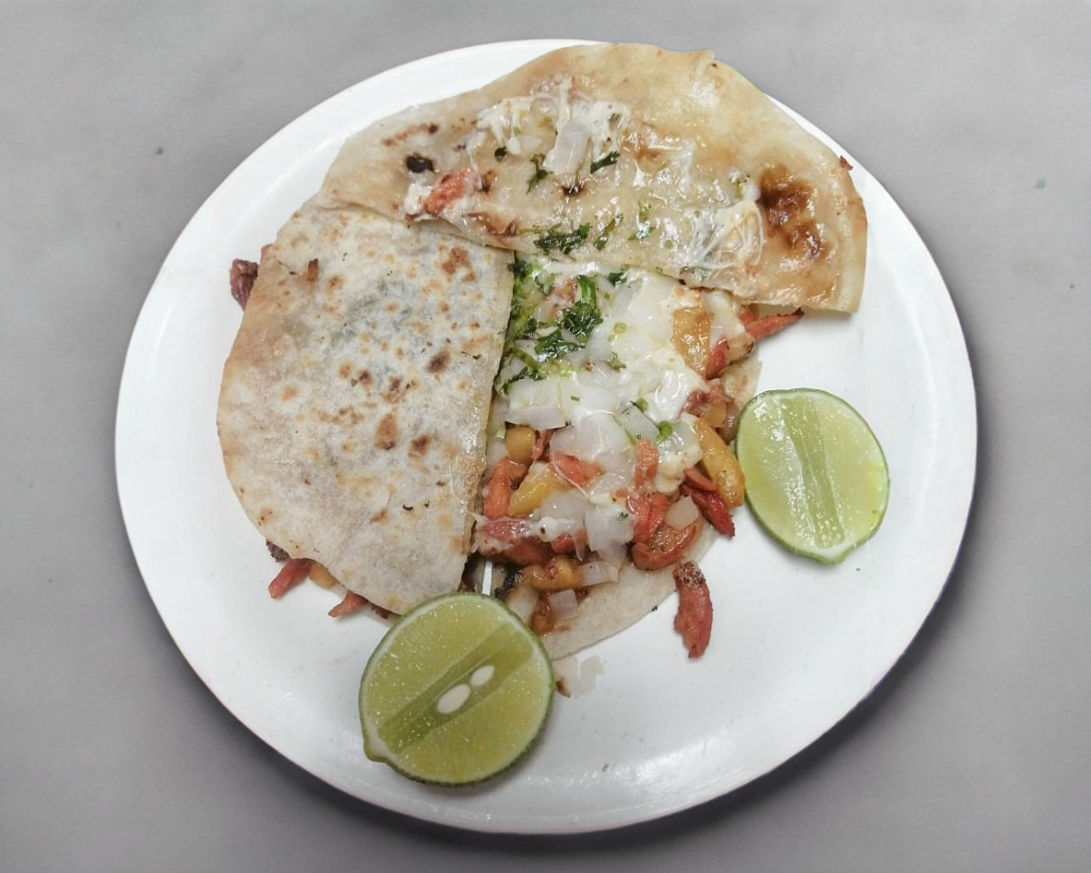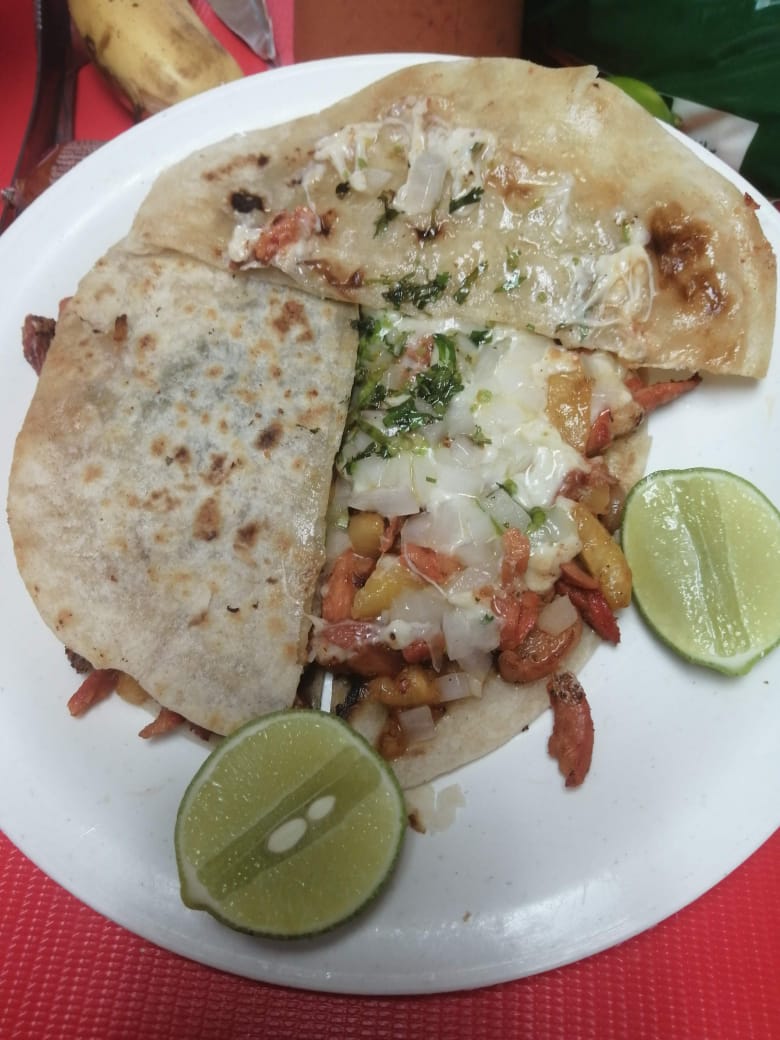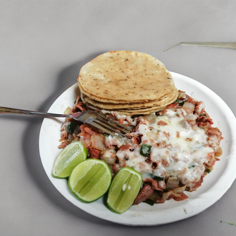 cebolla, chile poblano, jamon, chuleta, tocino, Carne al pastor y queso gratinado incluye tortillas y salsas