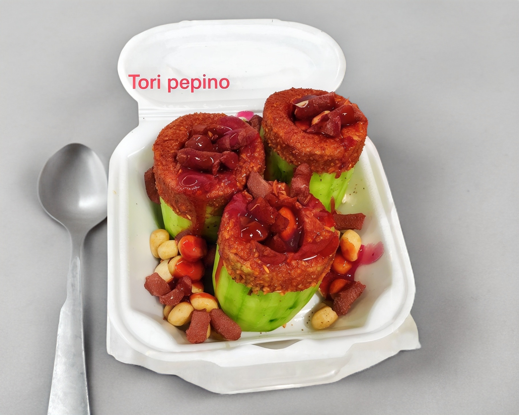 Pepino partido en tres pedazos, escarchados, cacahuate, chacachaca, clamato, salsas y chamoy.