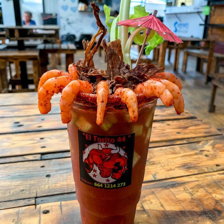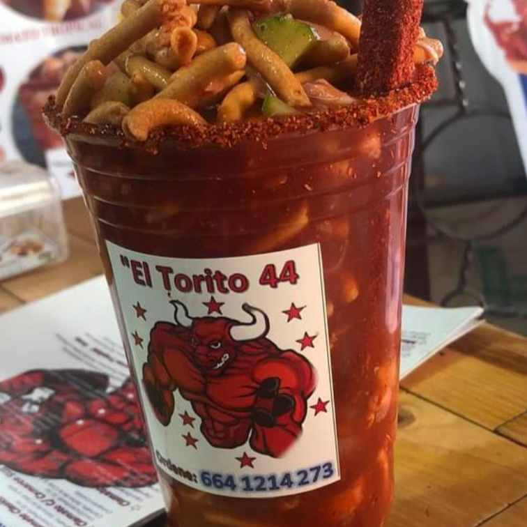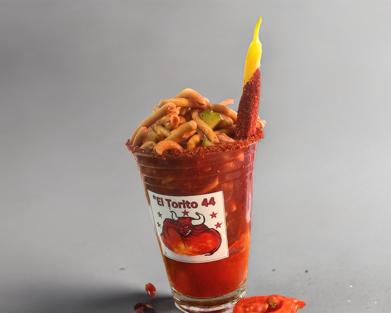 Vaso escarchado de 32 oz., clamato, salsa de la casa, apio, camarón cocido, mango, pepino y jamaica.