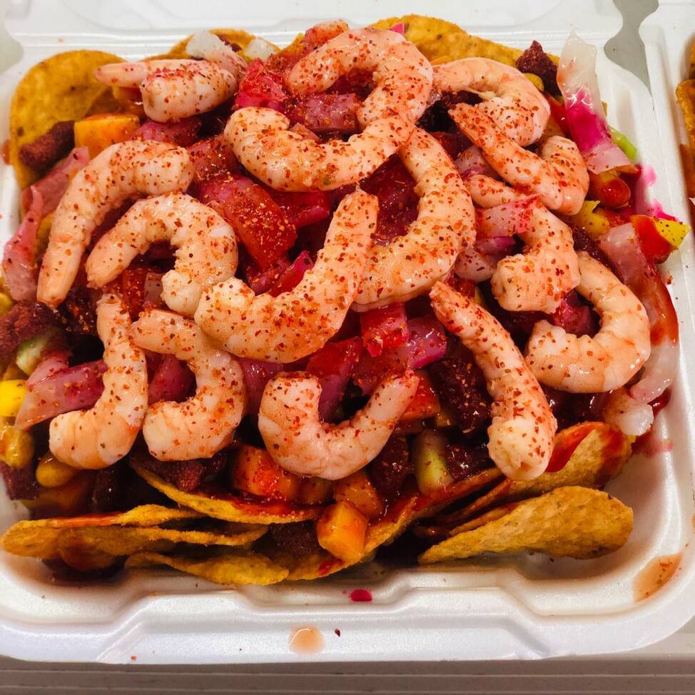 Tostitos, cacahuate, chacachaca, jícama, pepino, chamoy, salsa, clamato, camarón cocido y cueritos.