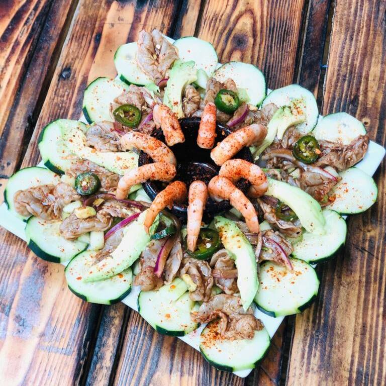 Carne seca (30 gr.), salsa de la casa, limón, Tajín, clamato y aceitunas.