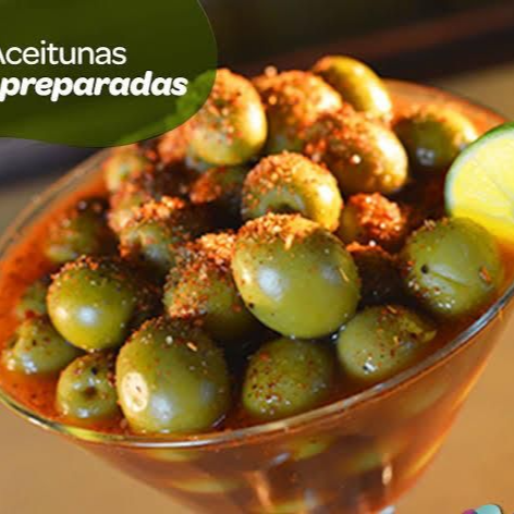 Vaso con aceitunas para botanear, salsas de la casa, limón, Tajín y clamato.