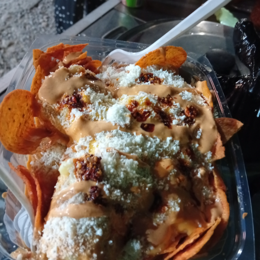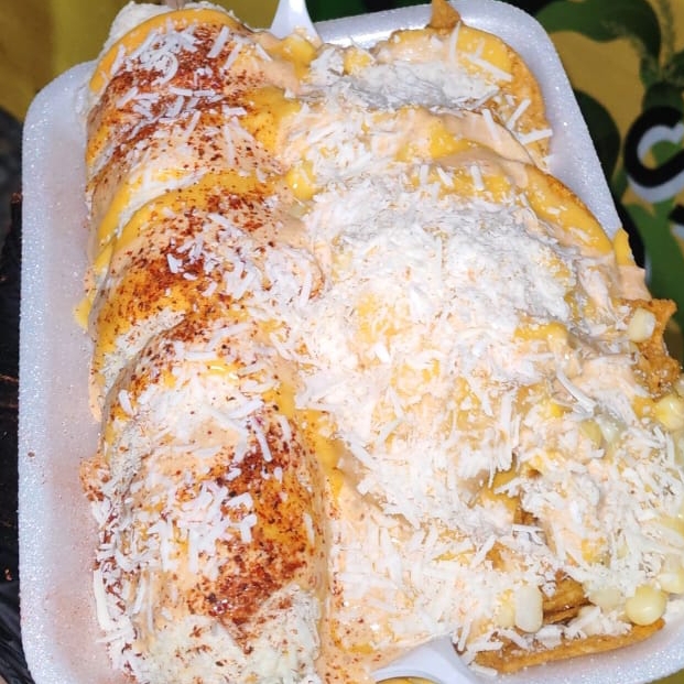 Mantequilla, mayonesa, queso, sal, limón, nachos, queso amarillo y jalapeños. Salsa y tajín al gusto.