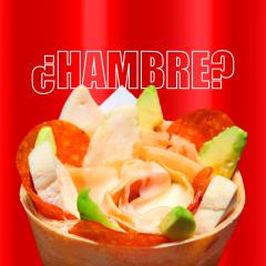 Queso monterrey, Pollo, Peperoni, Aguacate, Chipotle y Catsup.
