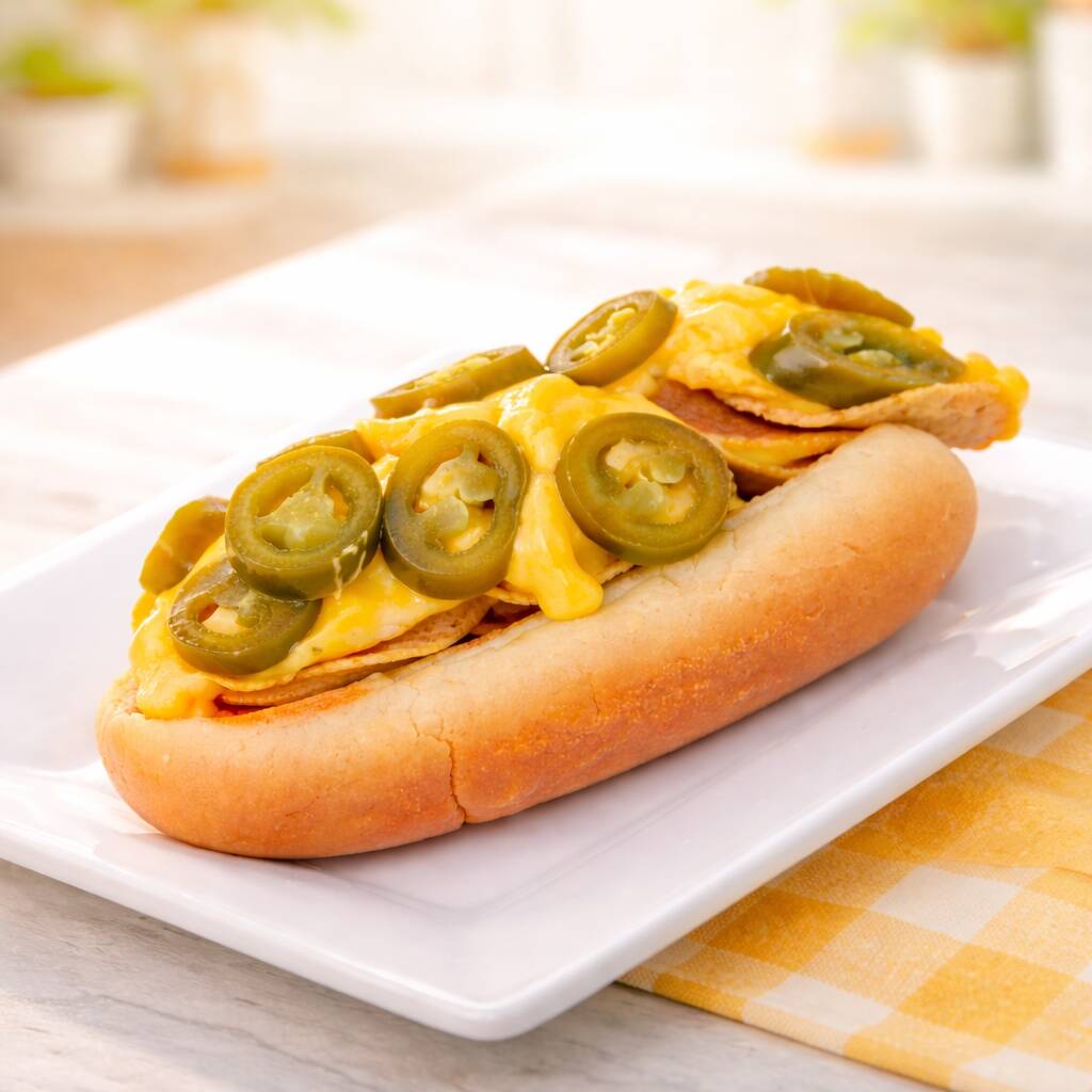 Pan, salchicha, mayonesa, totopos, queso, jalapeños.