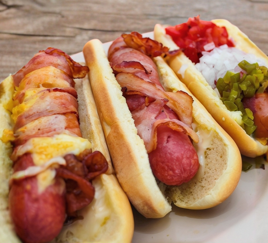 Hot Dog con salchicha de pavo envuelta con tiras de tocino acompañado de verdura y aderezos