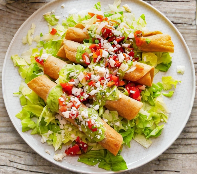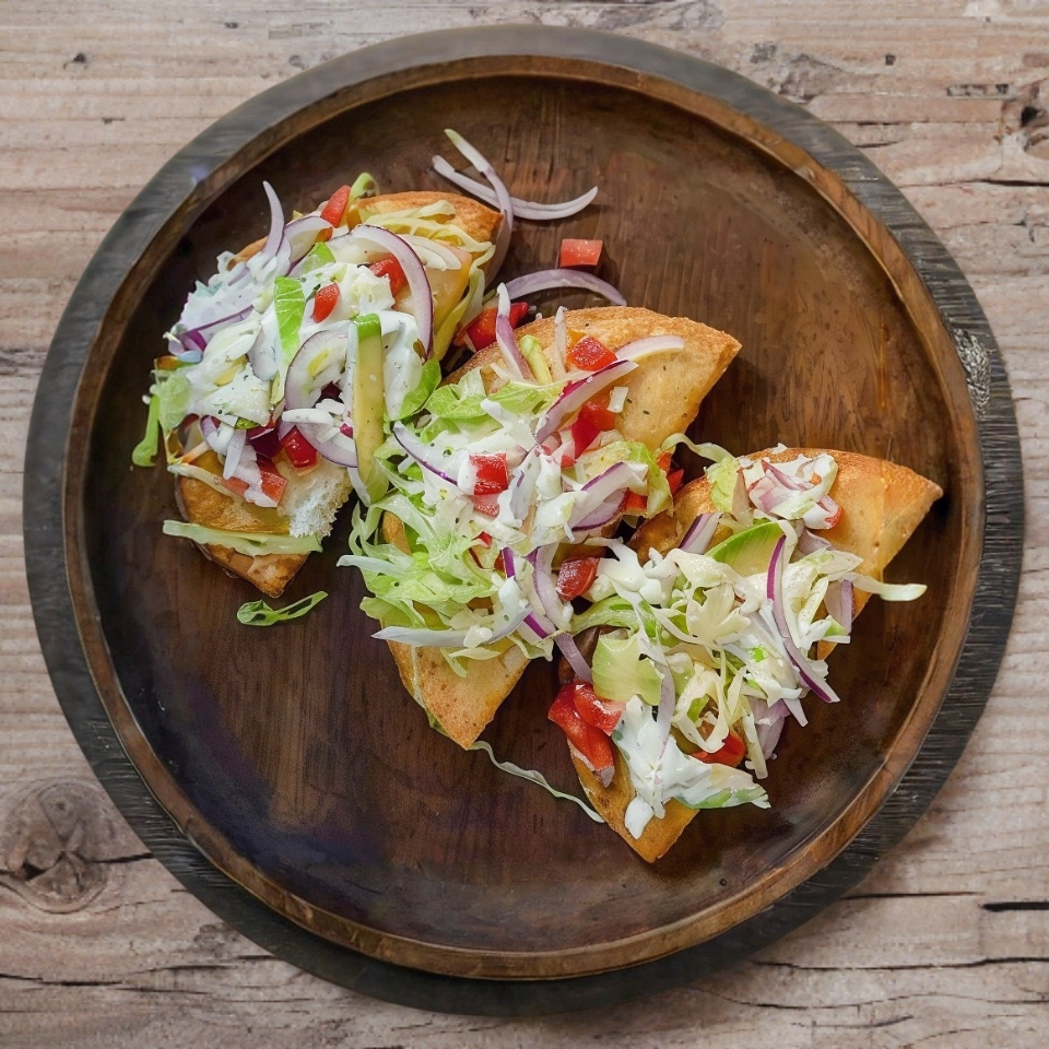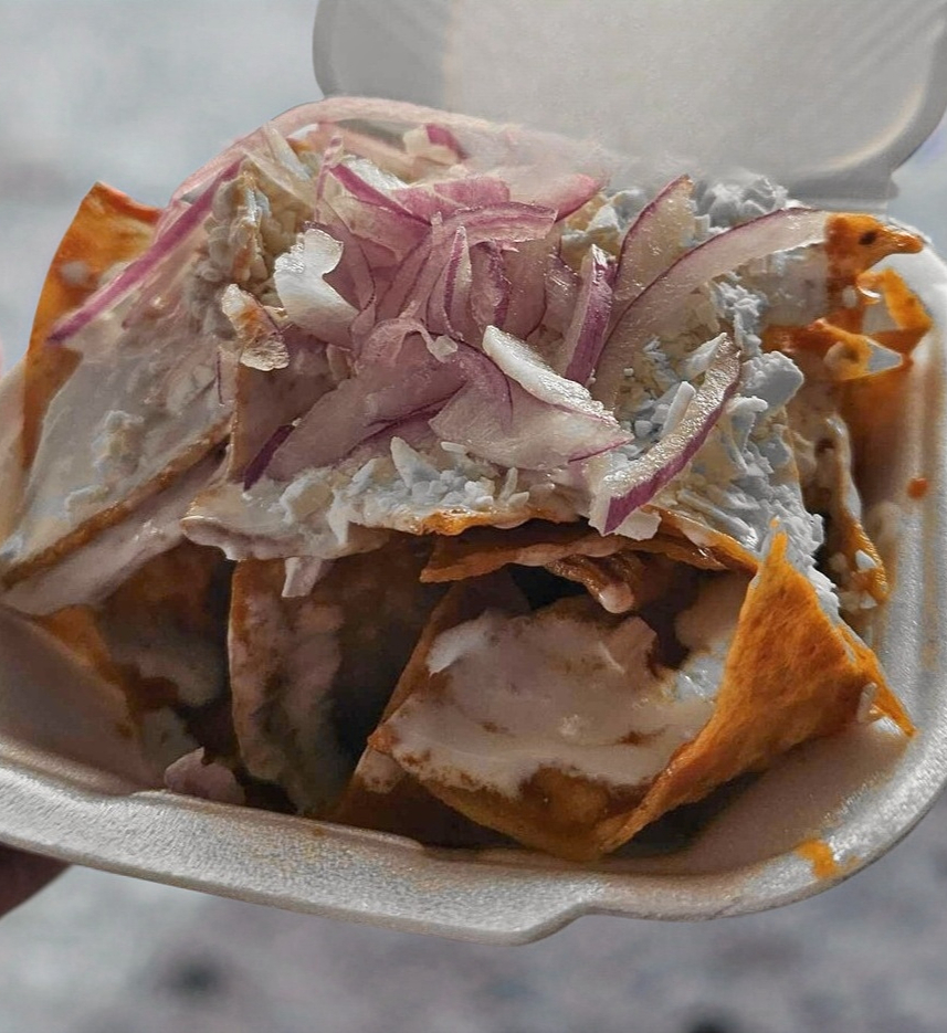 3 PIEZAS DE POLLO O DESHEBRADA DE RES A BASE DE FRIJOL, LECHUGA, CREMA, QUESO, Y SALSA DE LA CASA