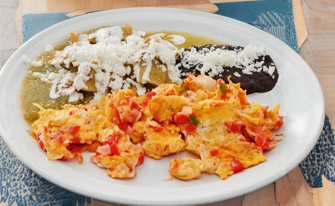 porción de huevo revuelto con salchicha, acompañado de chilaquiles a elección, queso, crema, cebolla además de frijol refrito y papas gajo