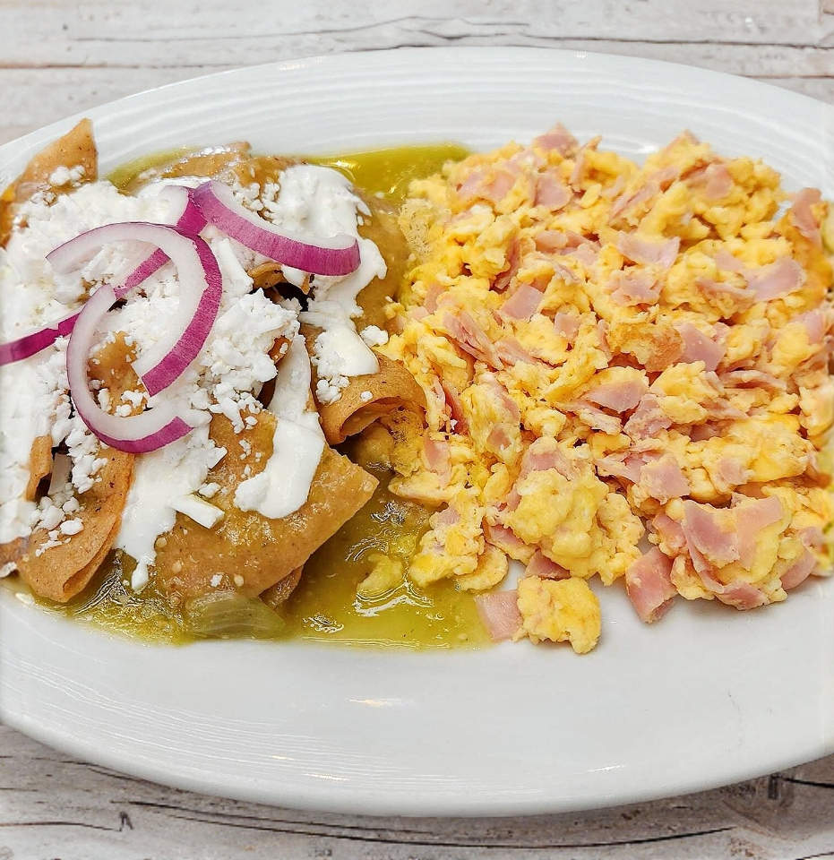 PORCION PUEQUEÑA DE CHILAQUILES CON HUEVO ESTRELLADO, REVUELTO O CARNE ACOMPAÑADO DE CREMA, QUESO, CEBOLLA