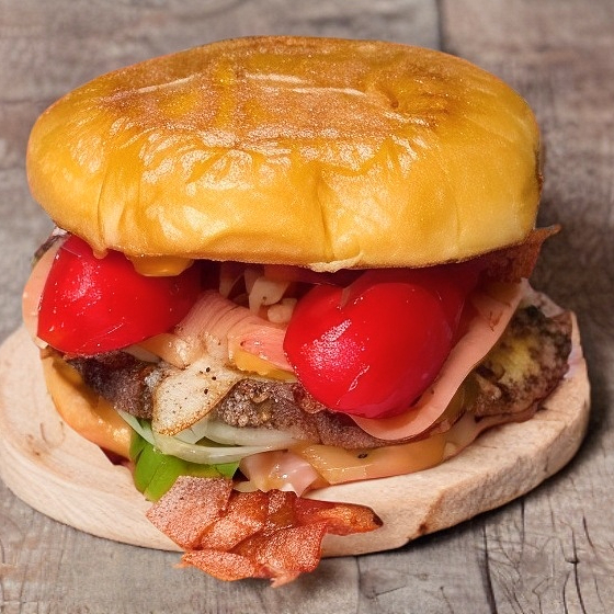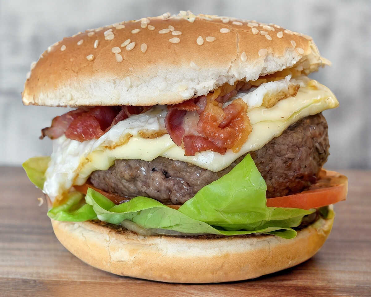 hamburguesa de res con queso, vegetales y un extra de tocino