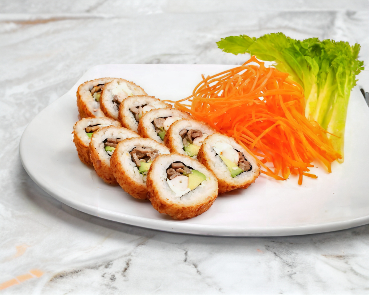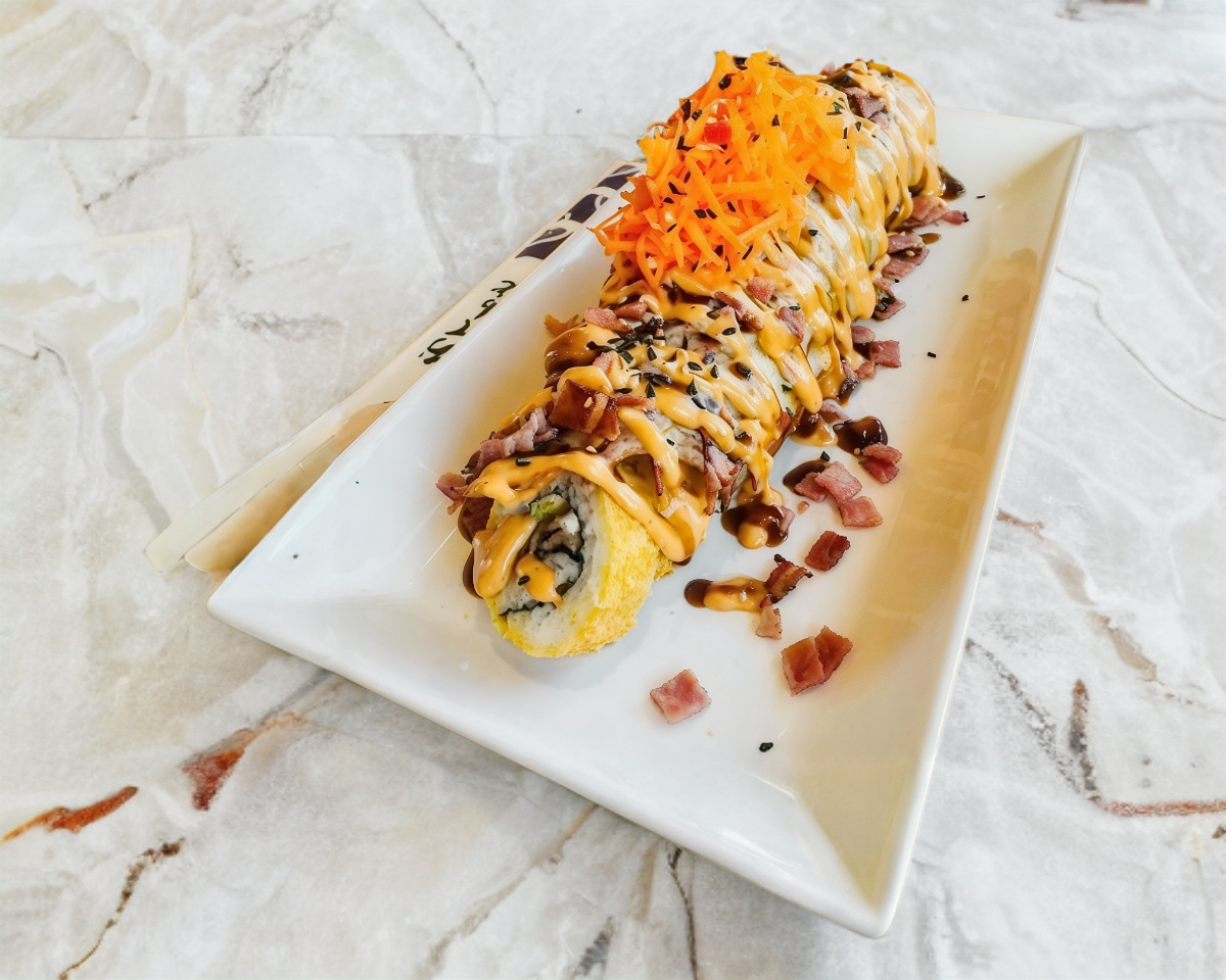 Por dentro queso crema,aguacate y carne,empanzado,gratinado con queso monterrey,spicy y tocino.