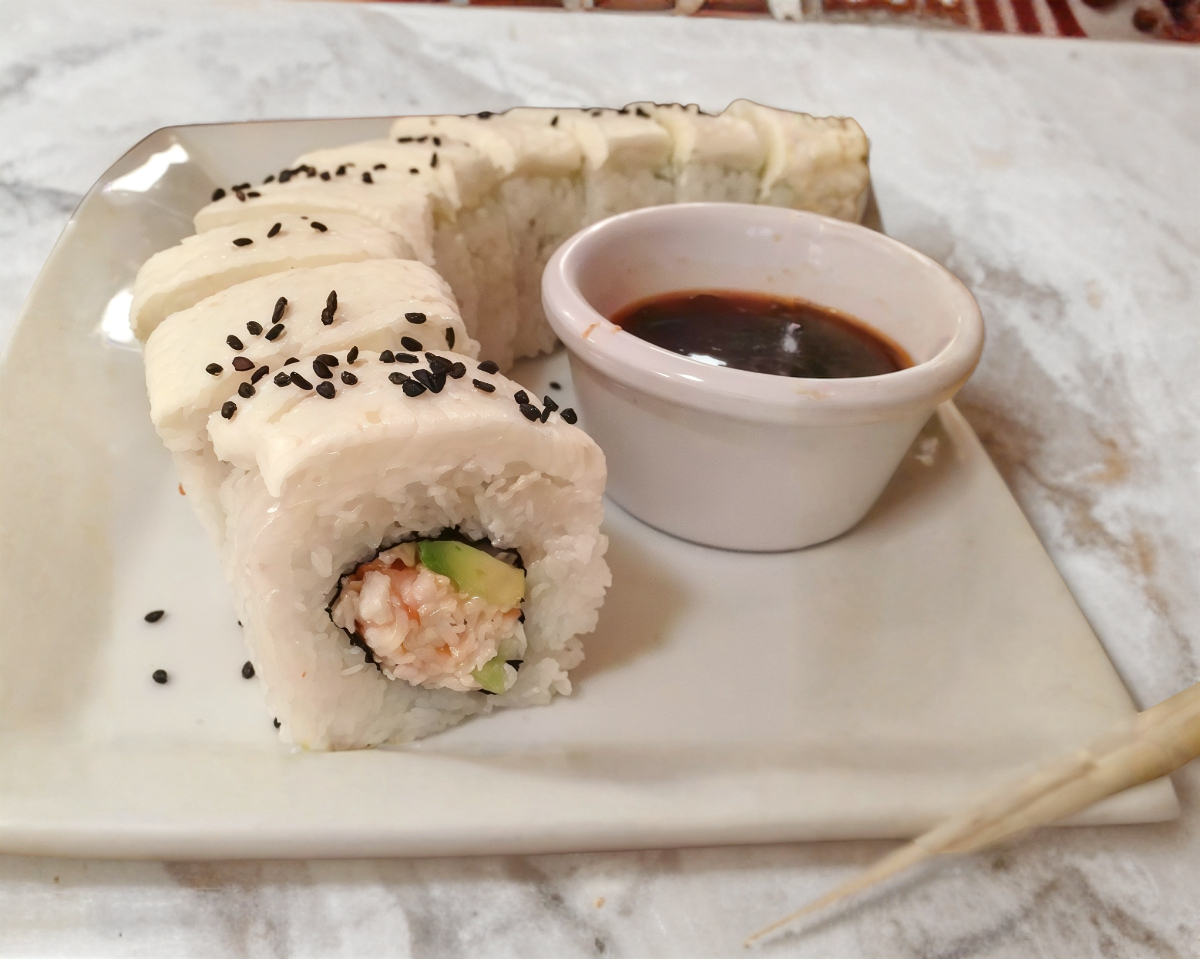 Camarón,queso crema y aguacate,forrado de queso crema.