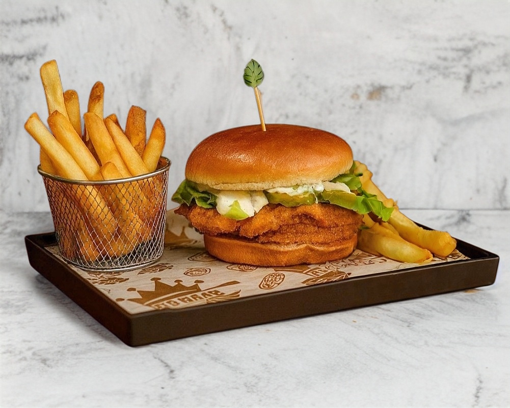 Hamburguesa de pechuga de pollo con lechuga, tomate, cebolla y aderezo ranch