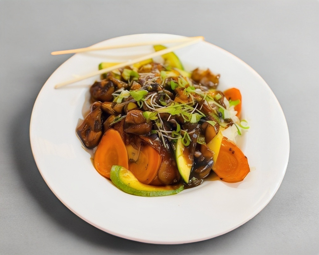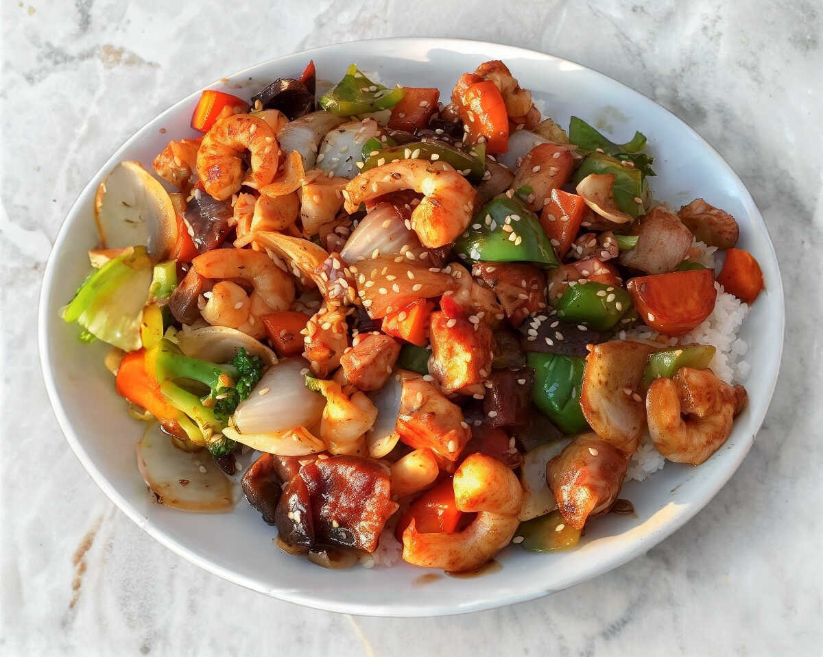 Arroz blanco,vegetales a la plancha con res,camarón, pollo,bañado en salsa teriyaki