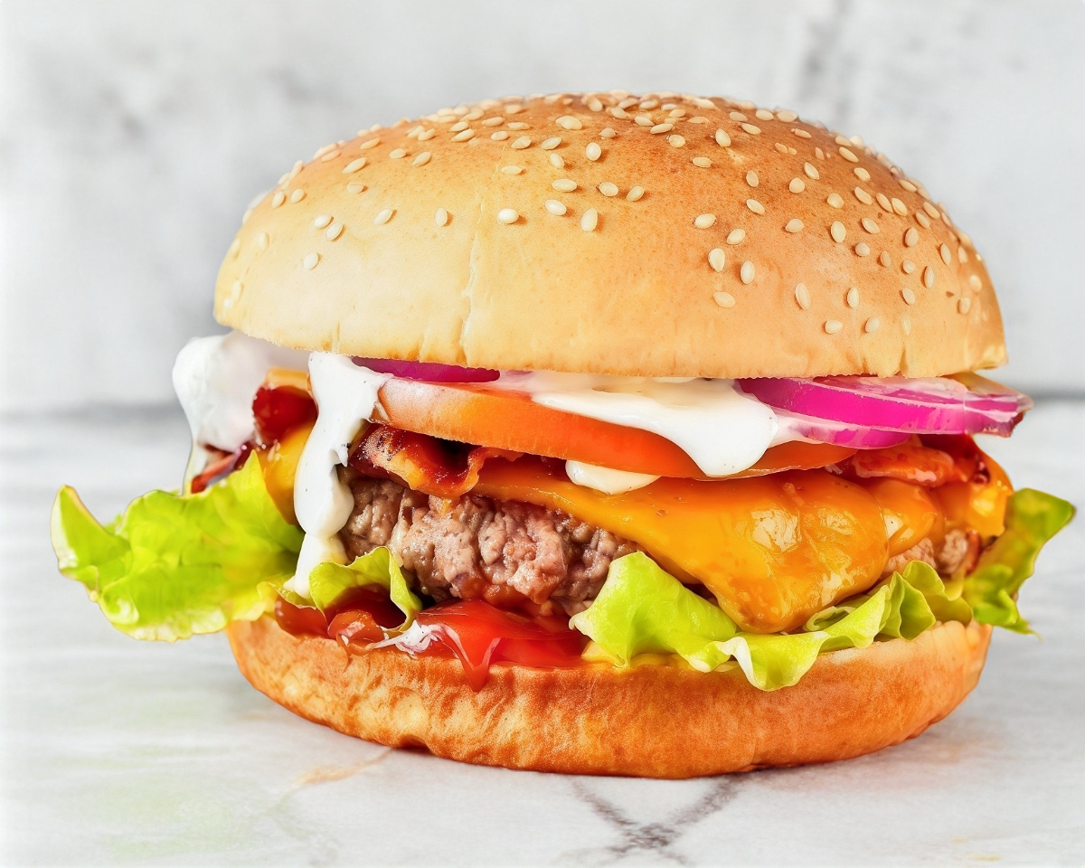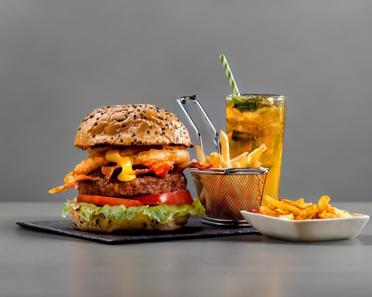Pan brioche, carne de res, queso amarillo, jitomate,cebolla,lechuga, mayonesa,mostaza, catsup y orden de papas.
