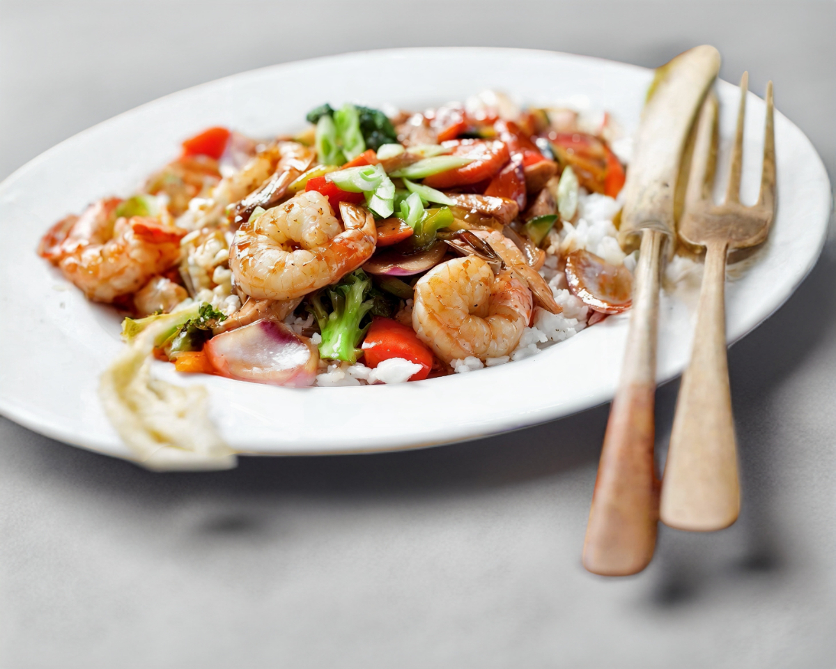 Arroz blanco,vegetales y camarón a la plancha, bañado en salsa teriyaki