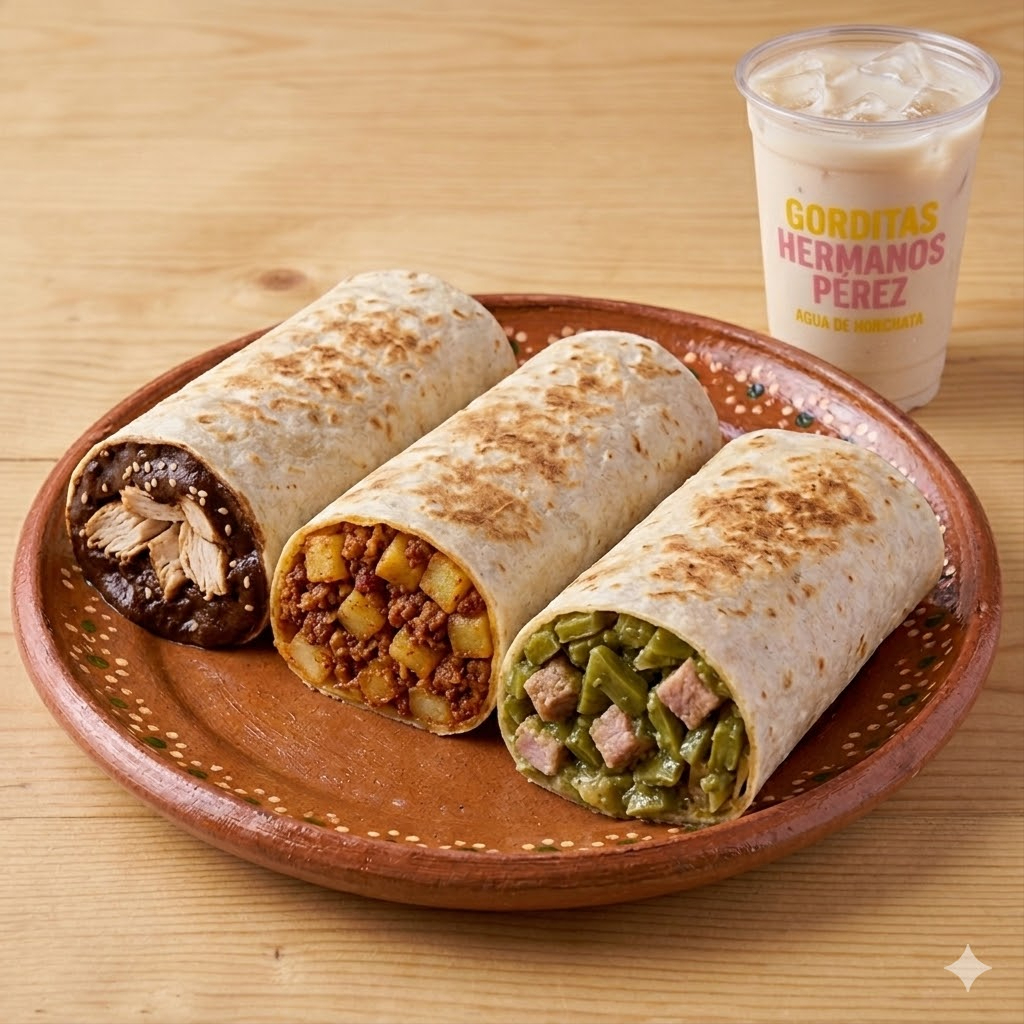 3 Burritos guisado a elegir y 1 agua fresca de la casa de 500 ml.