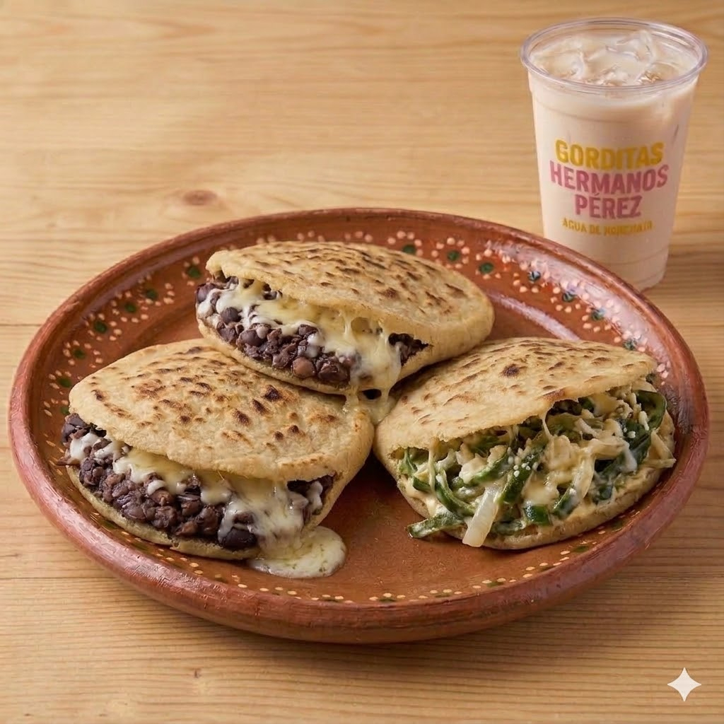 2 Gorditas de frijoles y 1 gordita de rajas, incluye agua fresca de la casa de 500 ml.