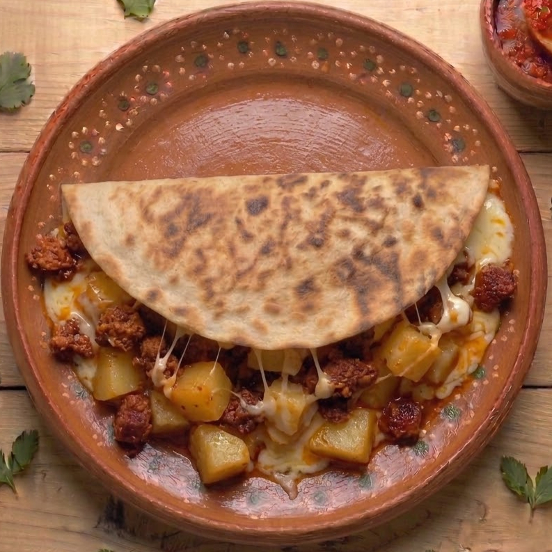 Quesadilla de papas con chorizo cocida en comal 1 pza.