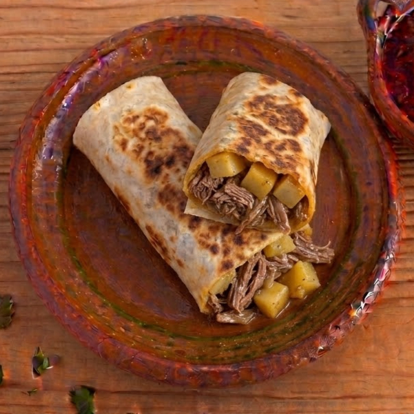 Burrito de papas con deshebrada cocido en comal 1 pza.