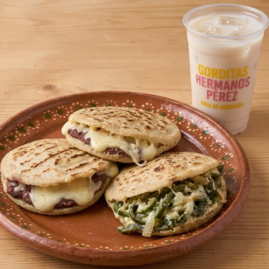 Gordita de Rajas 1 Pza*1 + Gordita de Frijoles con Queso 1 Pza*2 + Aguas Frescas de La Casa 500 Ml*1