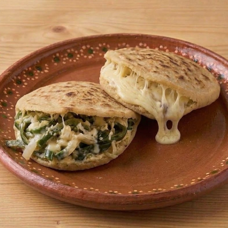 Gordita de rajas cocidas en comal 1 pza, incluye salsa de la casa.
