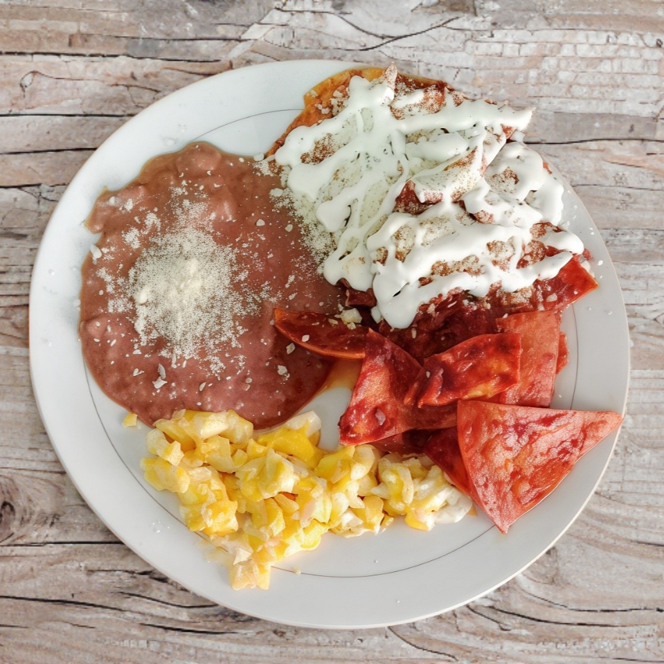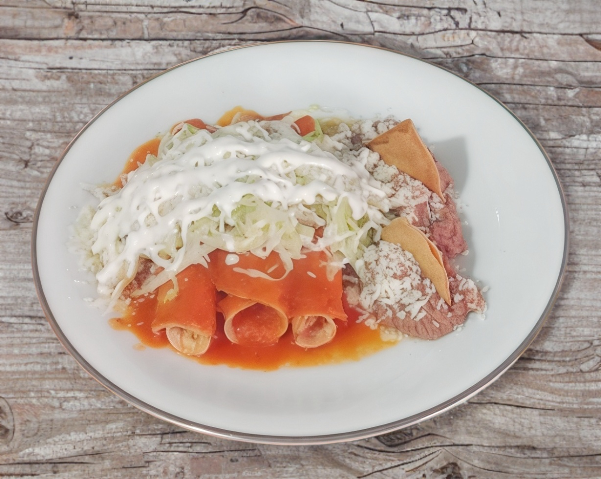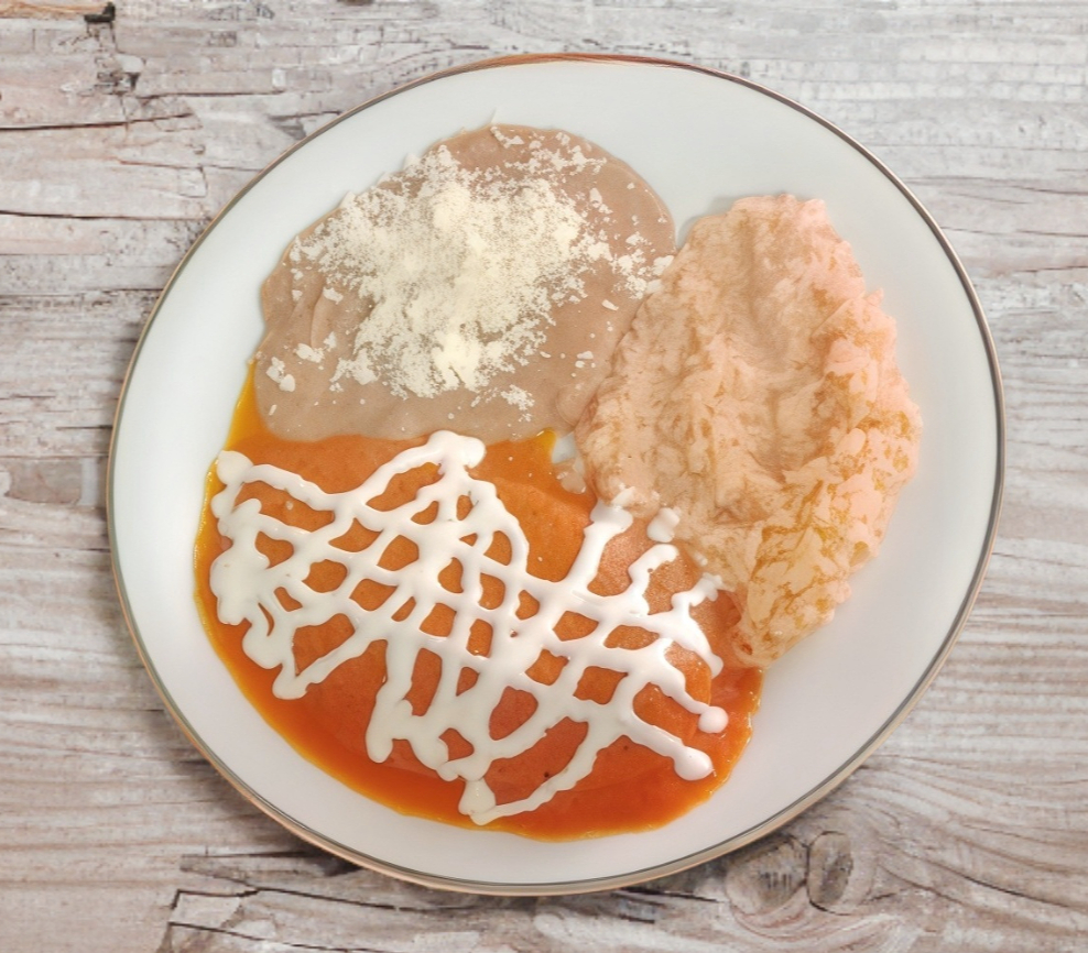 Bañadas en caldillo de Tomate. Encima Lechuga, Queso y Crema. Acompañadas de una porción de Frijol Refrito.