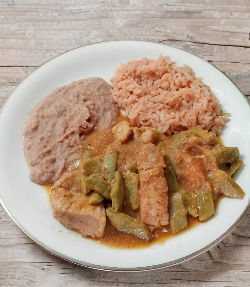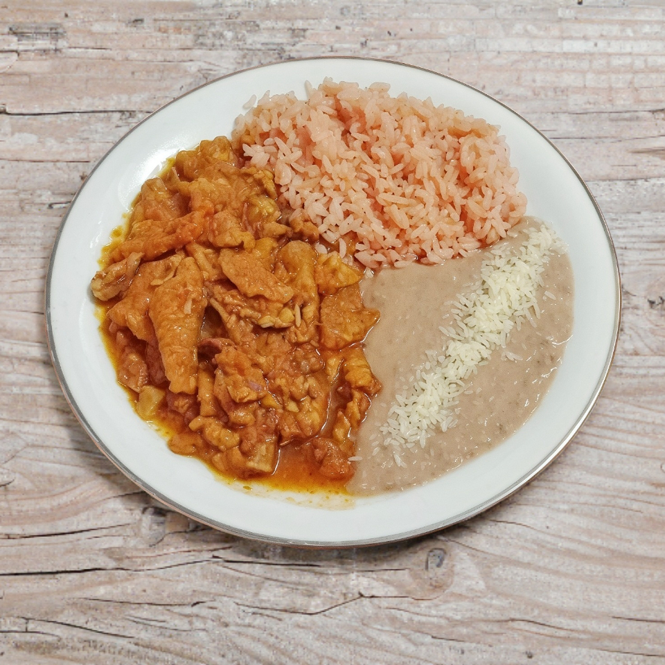 Chicharrón en Salsa de Tomate, acompañado de Tortillas de Maíz , Arroz y Frijol Refrito.