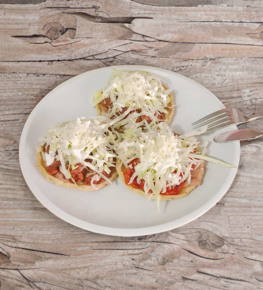 Tortilla de maíz pellizcada y frita, lleva frijol, Guisado, Lechuga, Queso y Crema. Los guisados son: Tinga, Chicharrón, Mole Verde, Picadillo, Rajas, Pierna con Nopal, Mole Rojo, Chile con Queso,Asientos de Carnitas , Bistec con Papas y Frijol con Queso.