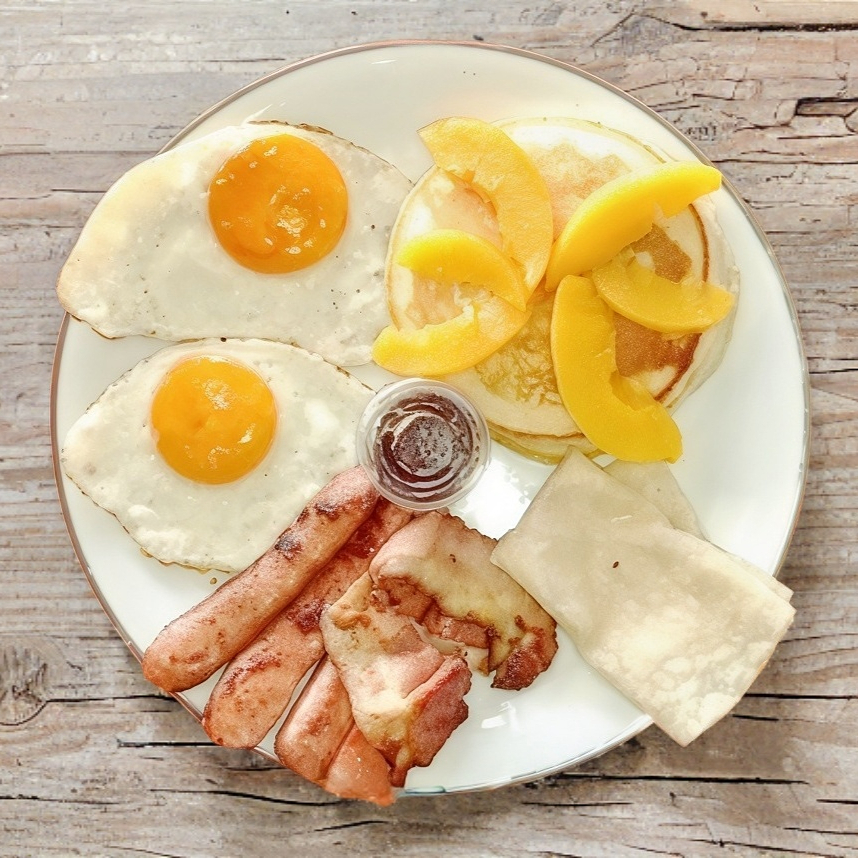 2 huevos estrellados, 2 hot cakes acompañados de frutas y Miel, Salchichas , Tocino y Tortilla de Harina.