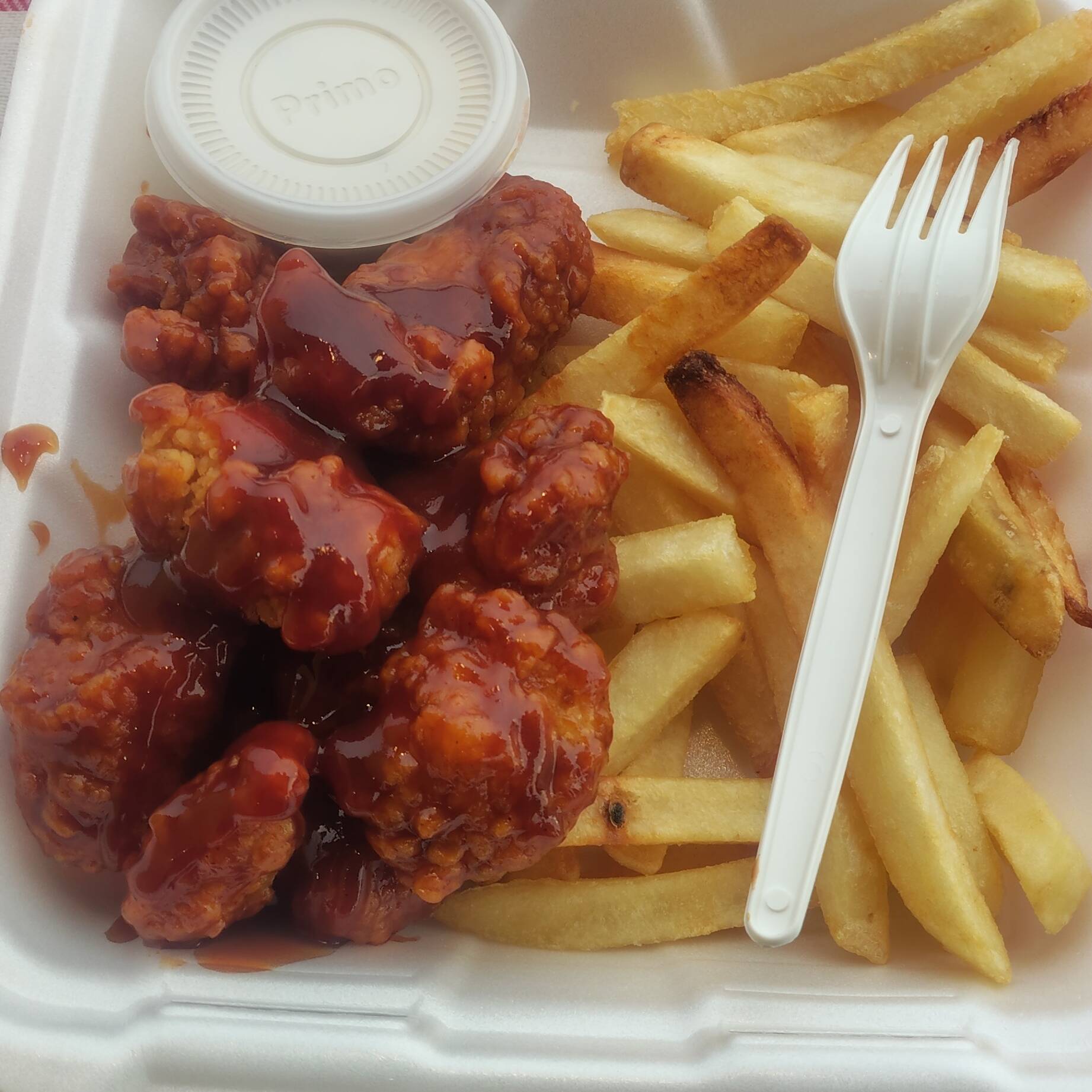 Boneless bañados en salsa BBQ, acompañados con papas fritas