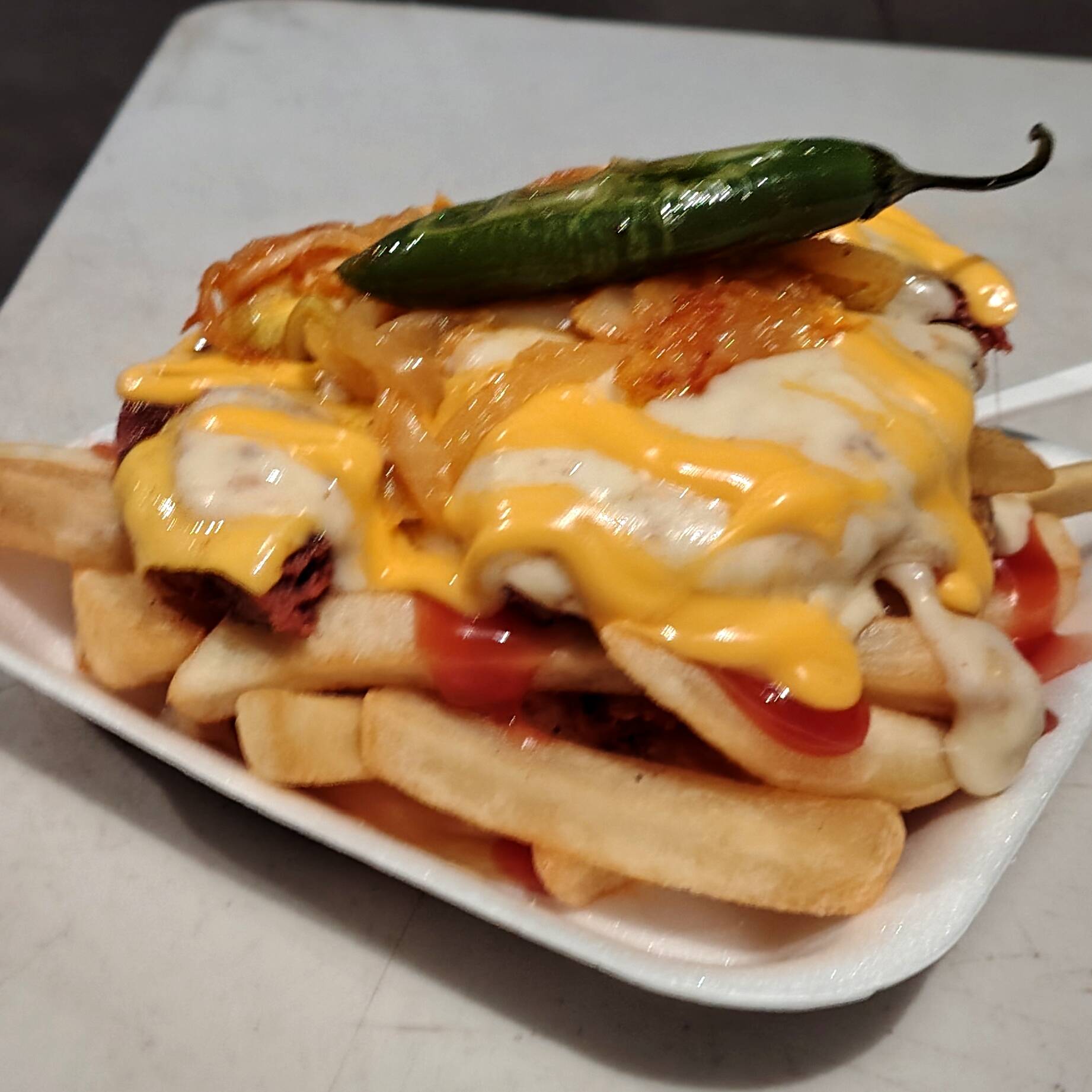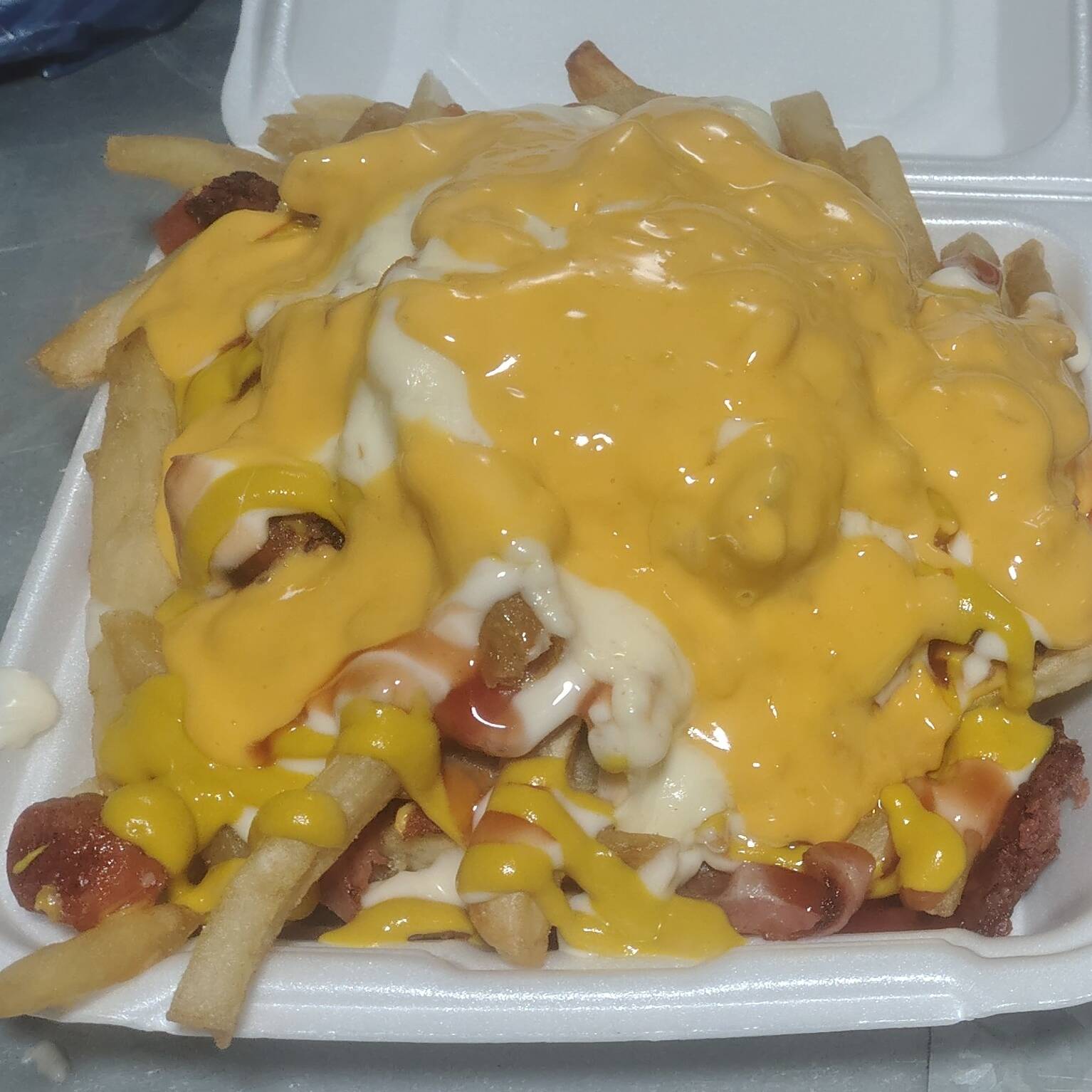 Papas Fritas Con Carne, Queso Amarillo, Queso Monterrey, Queso de Nachos, Mayonesa, Catsup, Mostaza