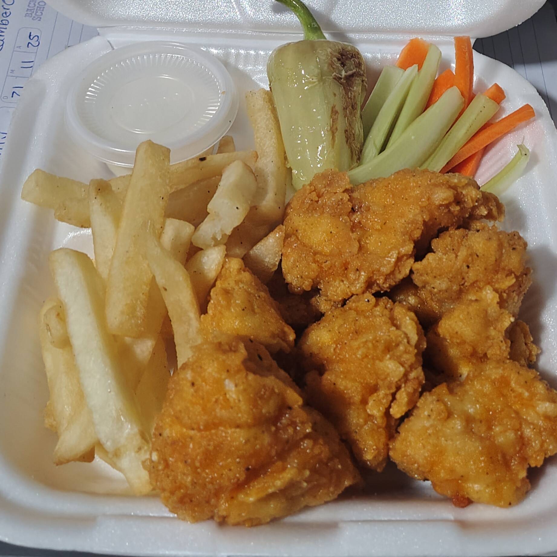 Boneles de Pollo, Papas Fritas, Zanahoria, Apio, Ranch