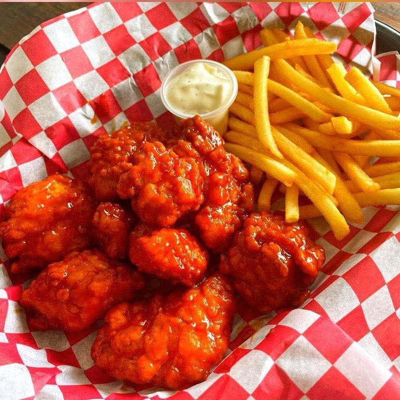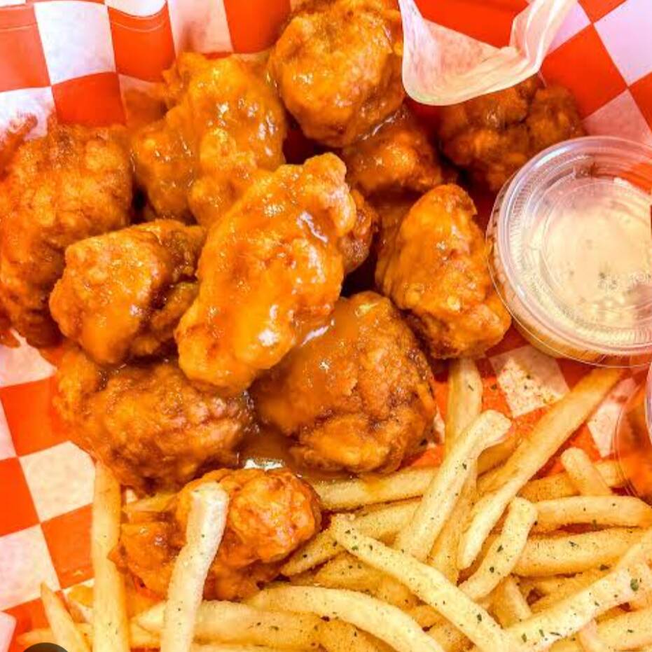 Boneles bañados en salsa bufalo acompañado con papas fritas