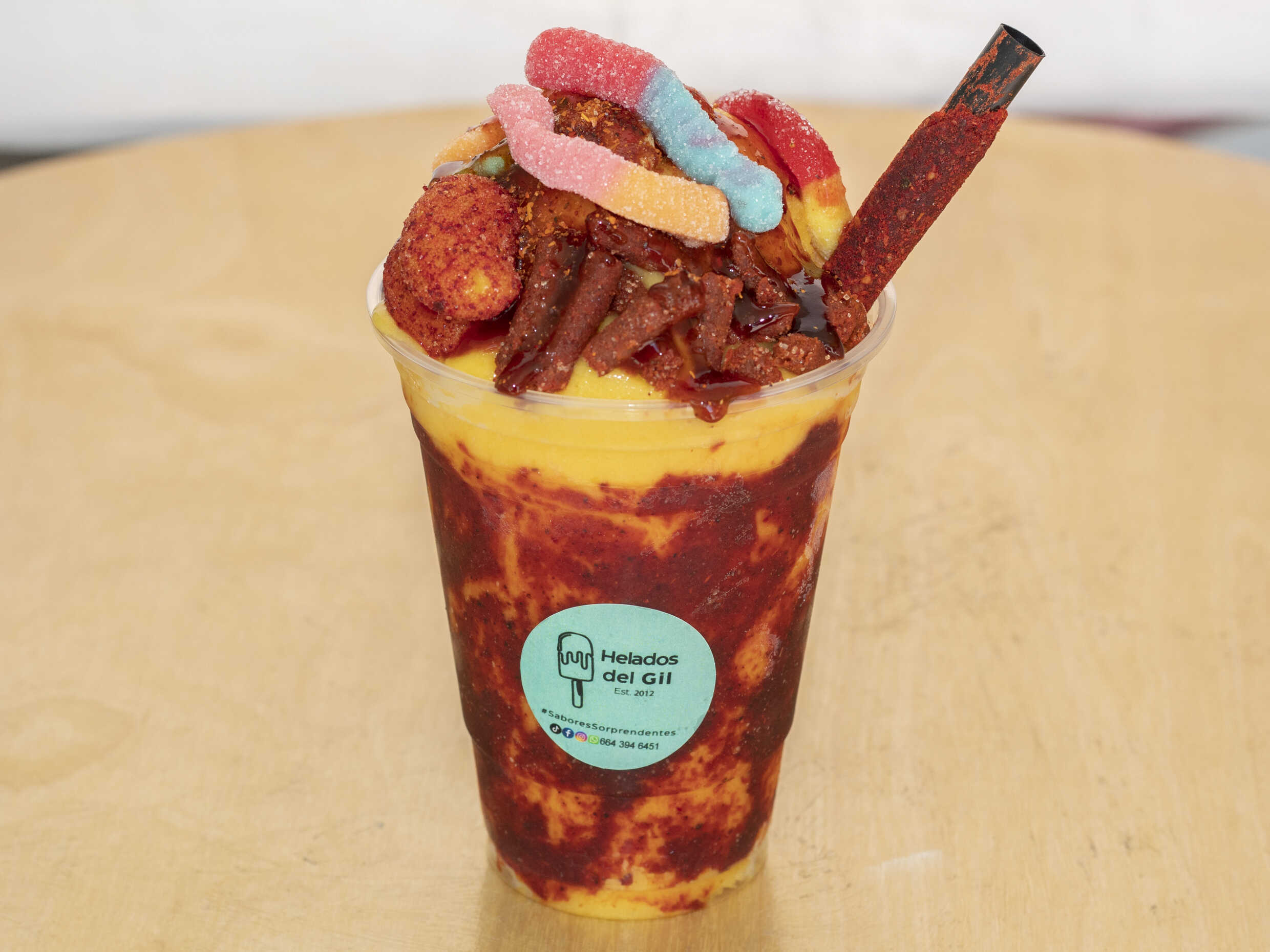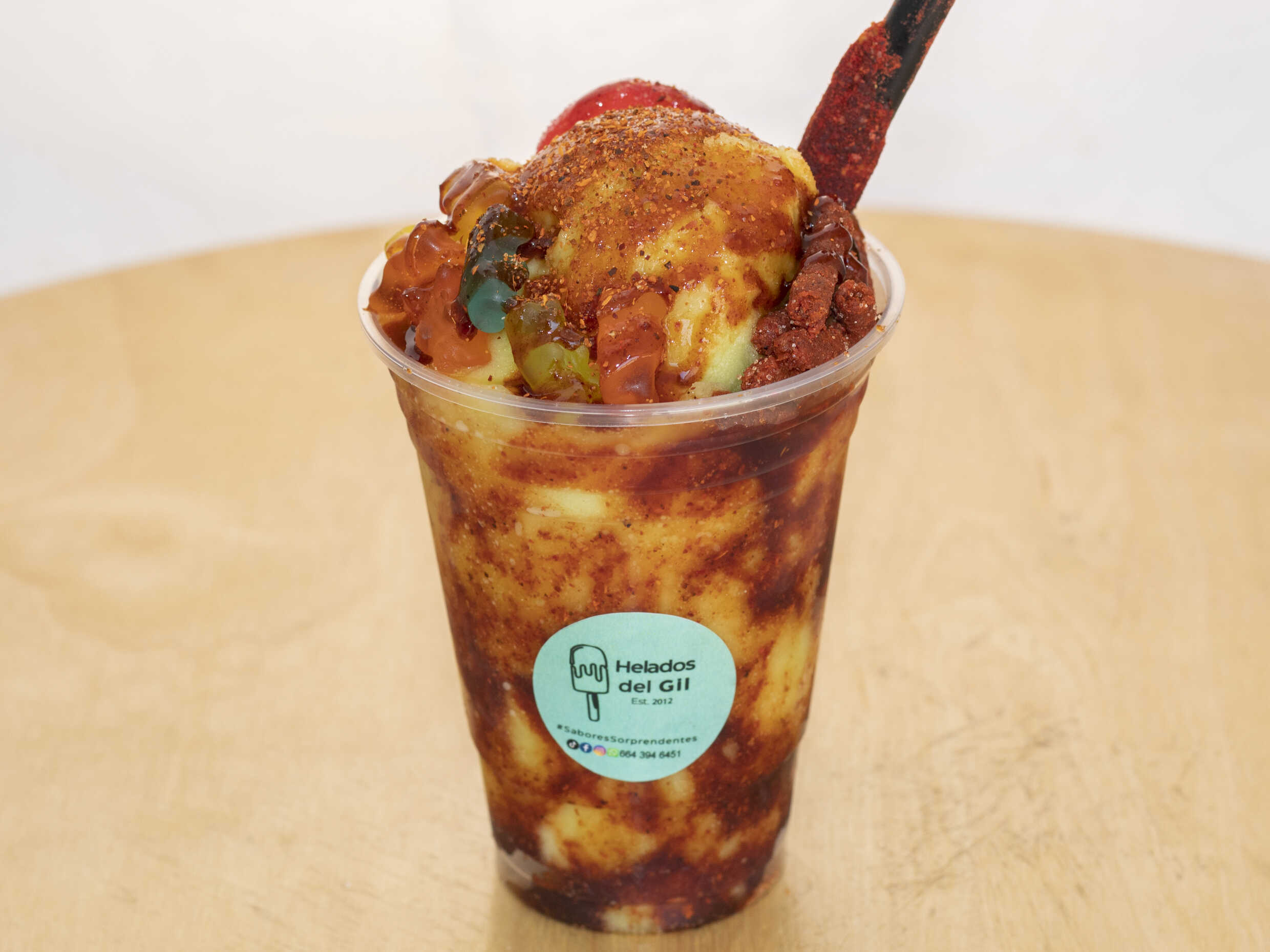 500 ml. de helado de mango natural preparado con escarcharindo, chamoy, chaca chaca, tajín y gomitas.