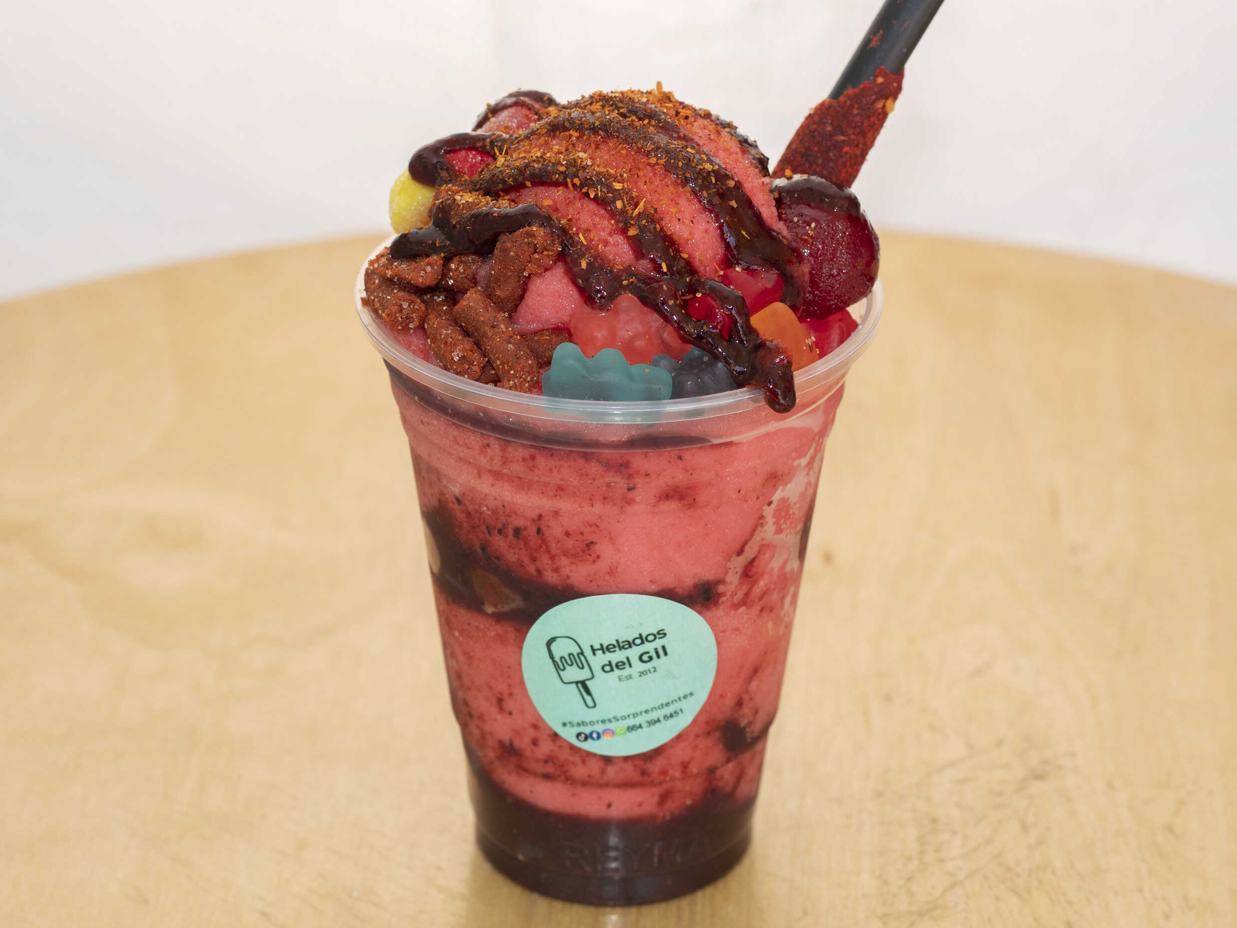 500 ml de helado de limón natural preparado con pelón pelo rico, chaca chaca, tajín y gomitas.