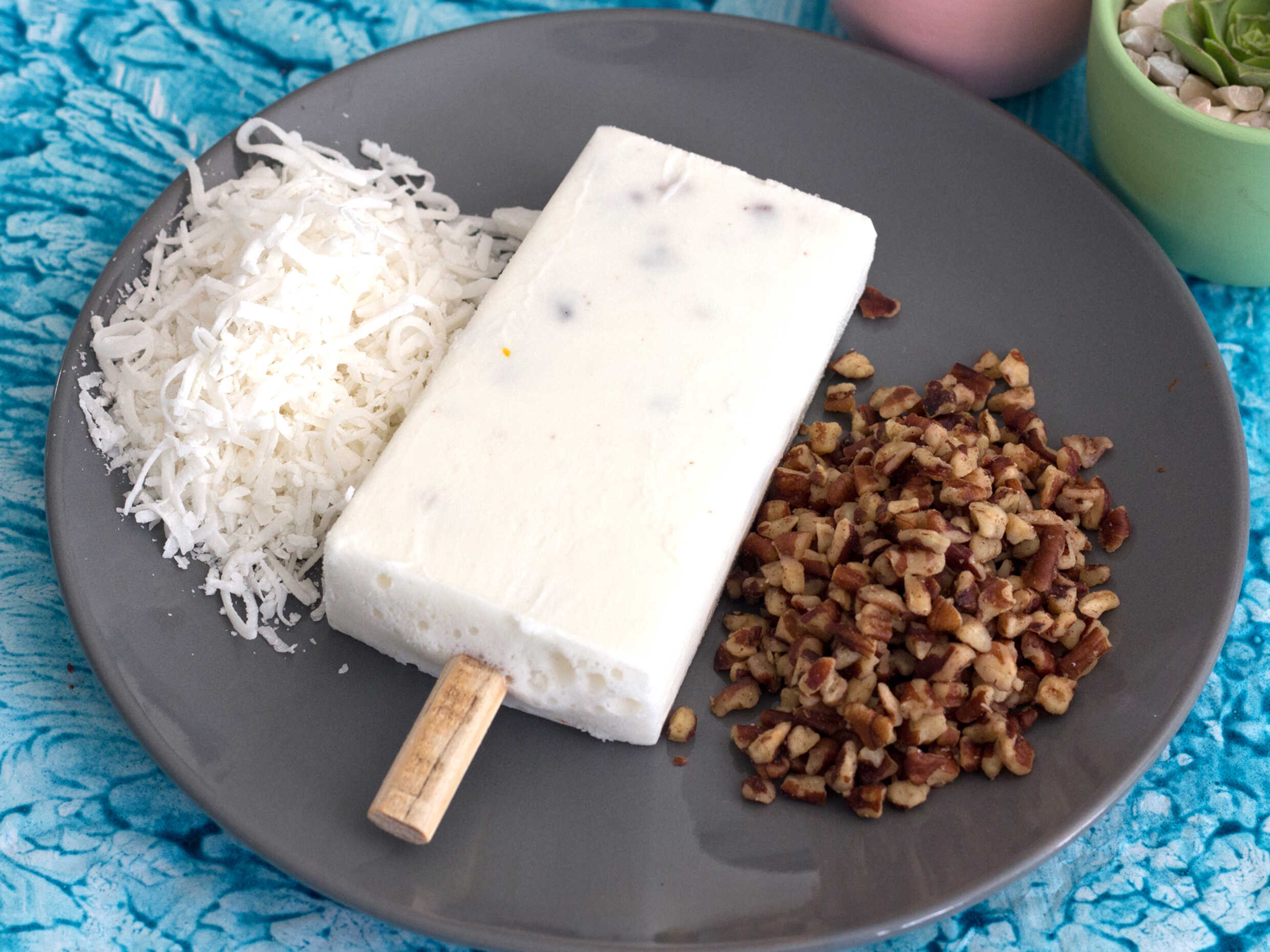 Paleta de 110 ml 4.55 grs cars x porción; leche de coco, coco natural sin azúcar, goma guar y endulzado con monk fruit.